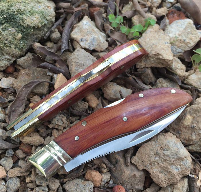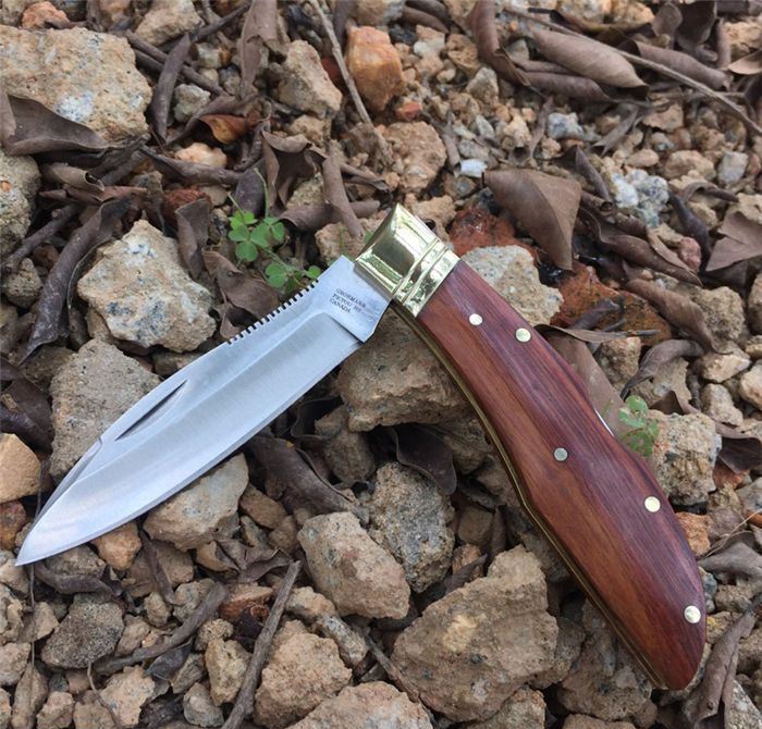 加拿大格罗曼品牌代工产品,品质一流,传统手作工艺,刀柄采用南美花梨(俗称巴花),铜内衬,搭配白铜头,精工抛磨;传统背锁小刀,铆合非常到位,做到严丝合缝,开合顺畅,手感一流,是不可多得的精品小刀,非常适合收藏和把玩!