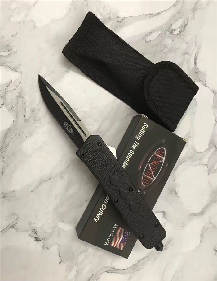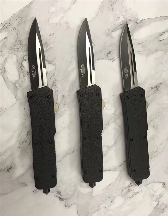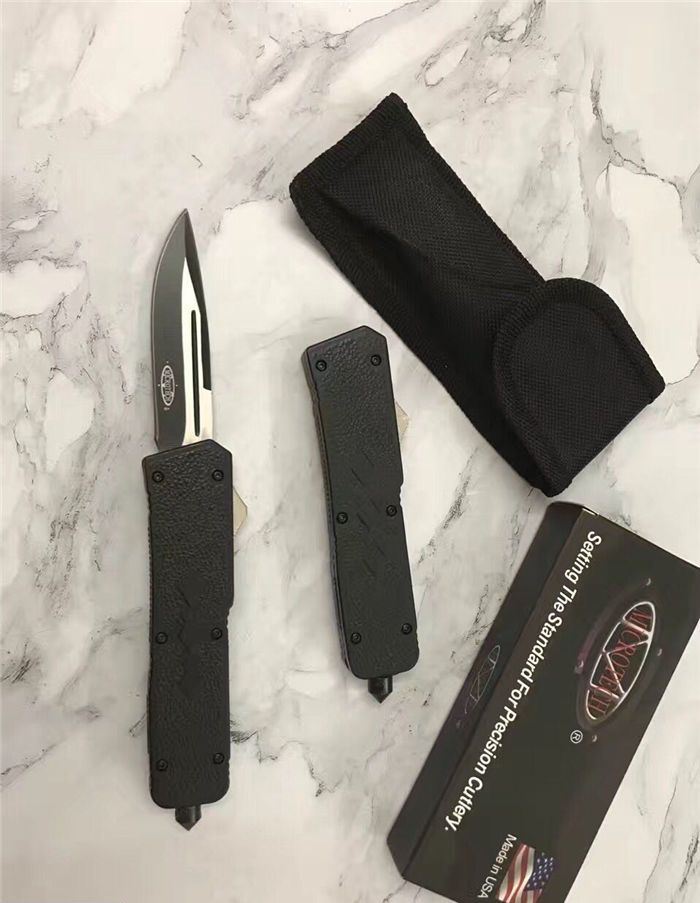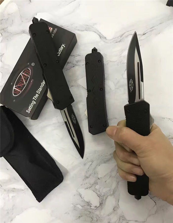 微技术伤齿龙小号A8直跳刀 全 长: 21.5cm (含尾锥长度) 刃 长: 8.5cm 刃 宽: 2cm 刃 厚: 3mm 刃 材: 440 硬 度: 58HRC 刀净重:195克 总重量: 215克(含包装物) 表 面: 黑色 柄 材: 锌铝合金 刀 鞘: 尼龙 锁 闭: 弹簧直出 刀柄表面采用了防滑处理,手感不错,刀柄采用锌合金铸造处理,硬度较高,稳定性较好。 配彩盒包装,高档尼龙刀套。