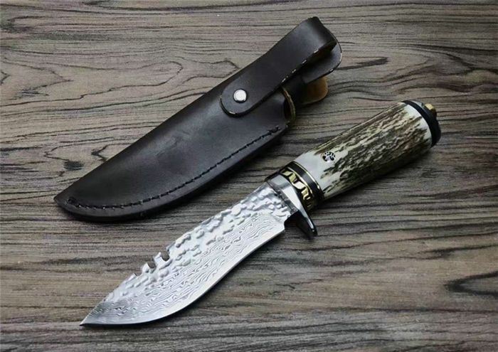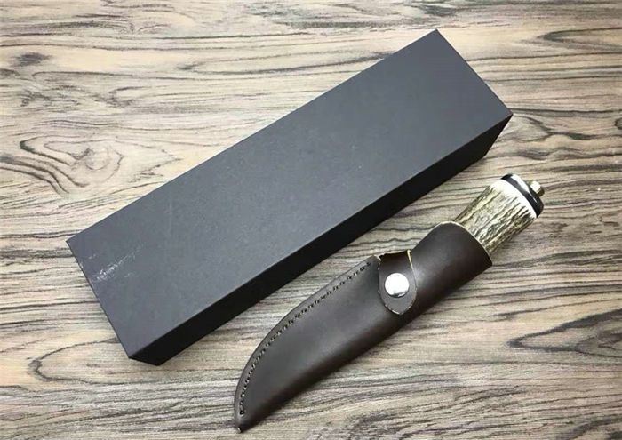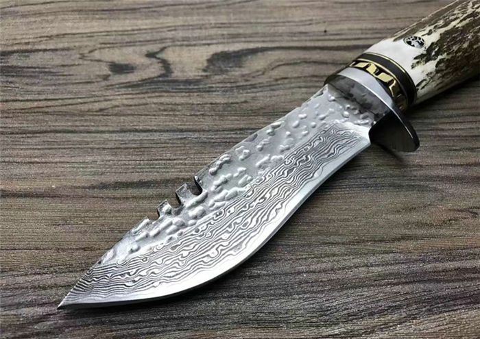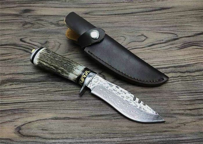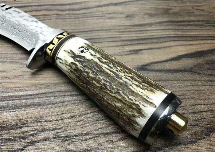 新款白鲨大马士革收藏直刀 全 长: 24cm 刃 长: 12.2cm 柄 长: 11.8cm 刃 宽: 3.2cm(最宽处) 硬 度: 59HRC 刃 厚: 0.4cm 柄 材: 鹿角柄 重 量: 165克 刃 材: 手工锻打大马士革钢 其 他: 真皮套