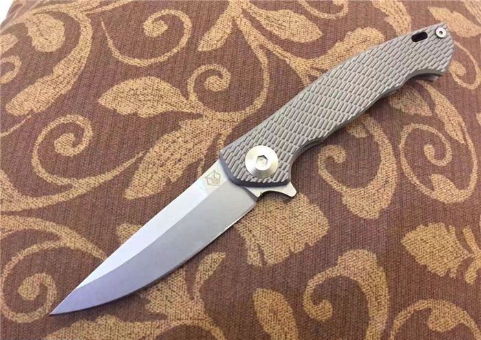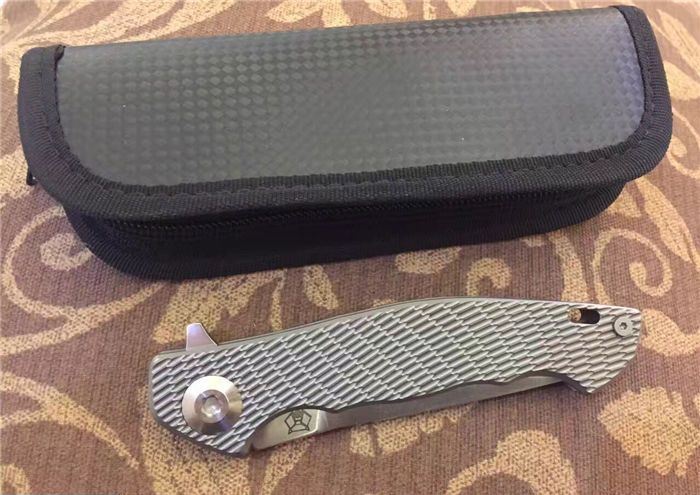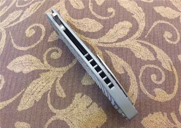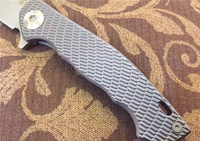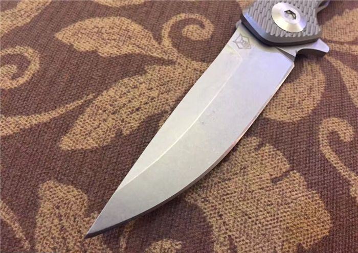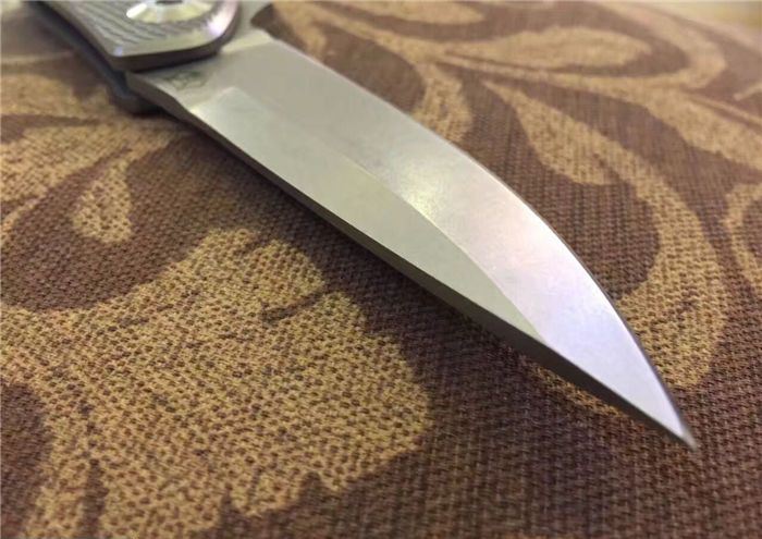 熊头钛柄折刀D2钢 全 长:21cm 刃 长:9.5cm 柄 长:11.5cm 刃 宽:2.5cm 刃 厚:3.0mm 刃 材:进口高速D2 总 量:280g (含包装物) 硬 度:60HRC 表 面:石洗或砂光两款可选 柄 材:正反面CT-4钛柄 刀 夹:超弹力钛夹 锁 型:线锁。 螺 丝:所有螺丝420不锈钢硬度HRC45,全CNC精雕加工,内置轴承 结 构:线锁 其 他:配高档刀套