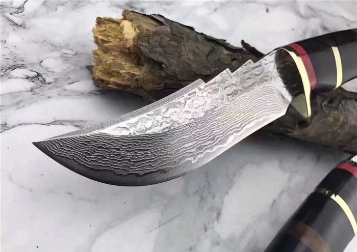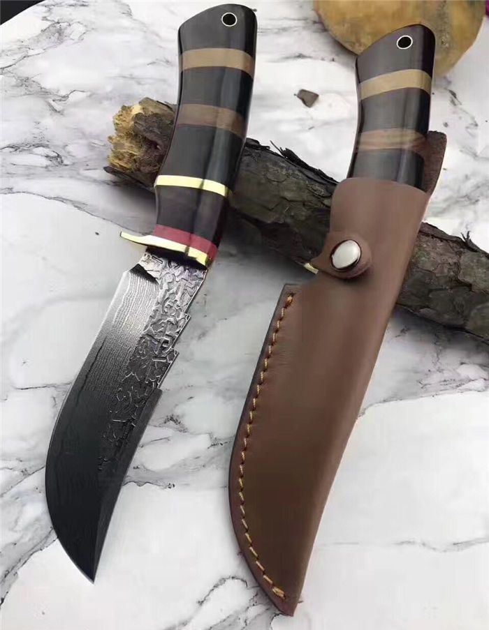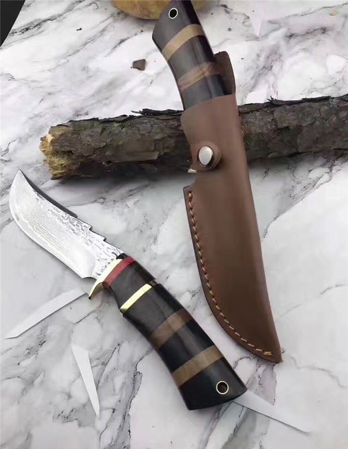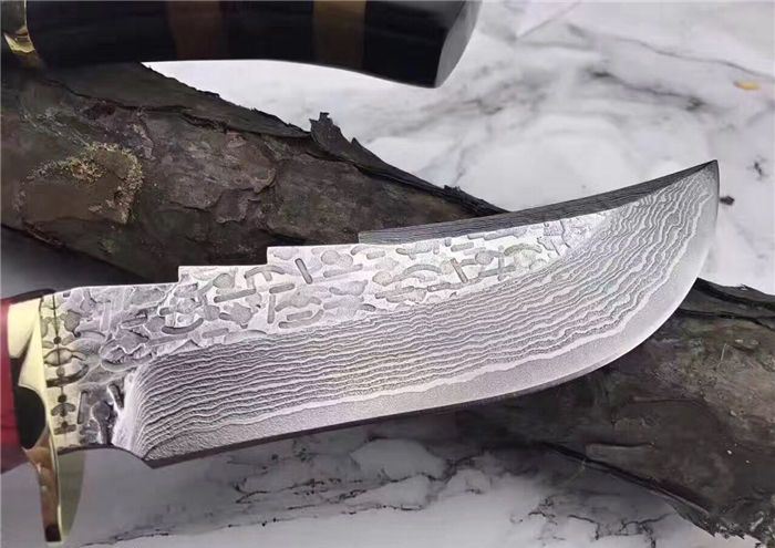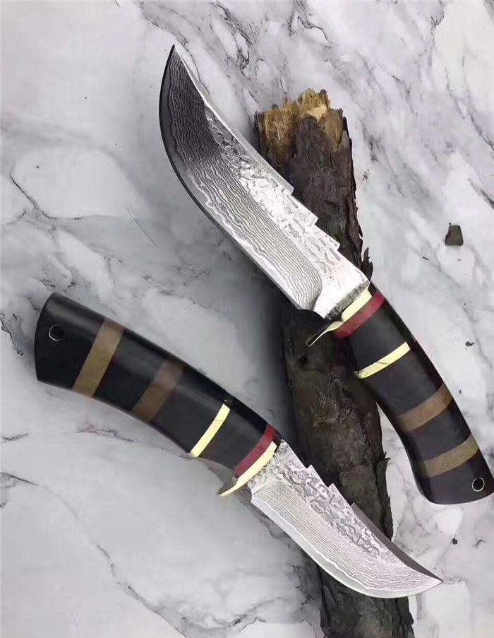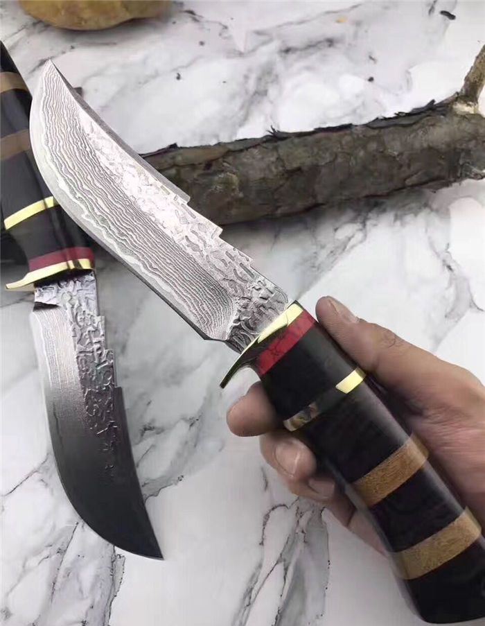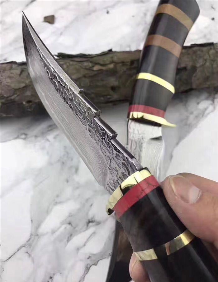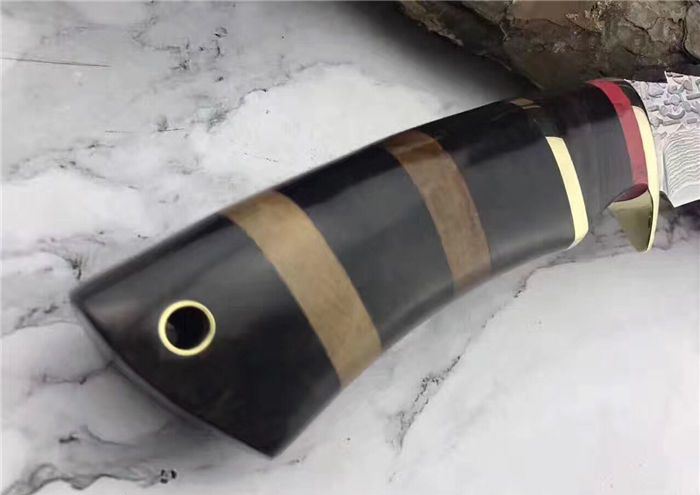 翼龙木柄款大马士革猎刀 全长:25.5cm 刃长:13cm 手柄:12.5cm 钢材厚度:4.2mm 硬度:59-60HRC 刃材:大马士革钢80层 手柄用料:白钢护手+G10黑+黄铜隔片+黄檀木 纯手工精造,雄狮柳钉固定,刀柄吊坠彩体轮珠,非常高端大气,配真牛皮手工刀套,礼品盒包装。