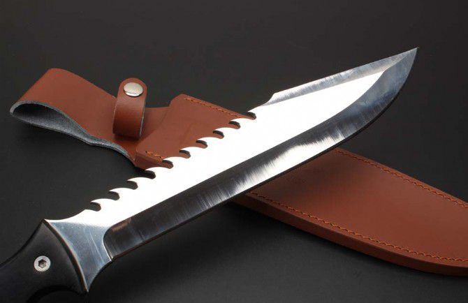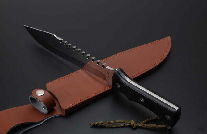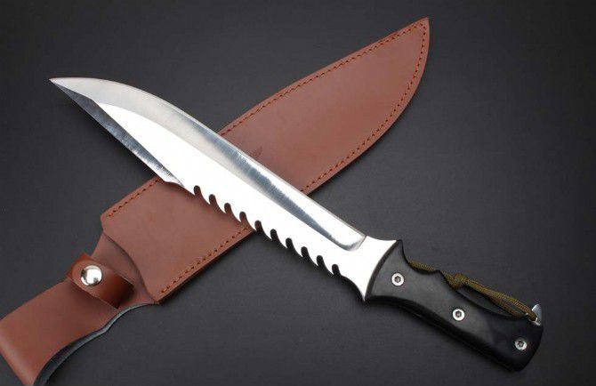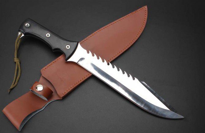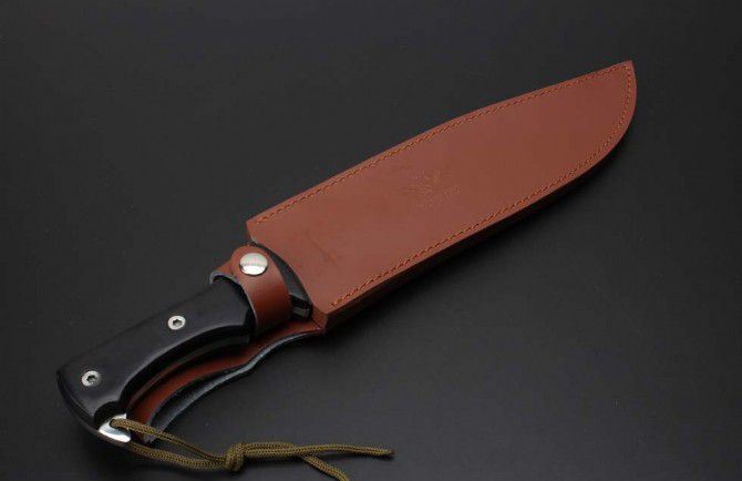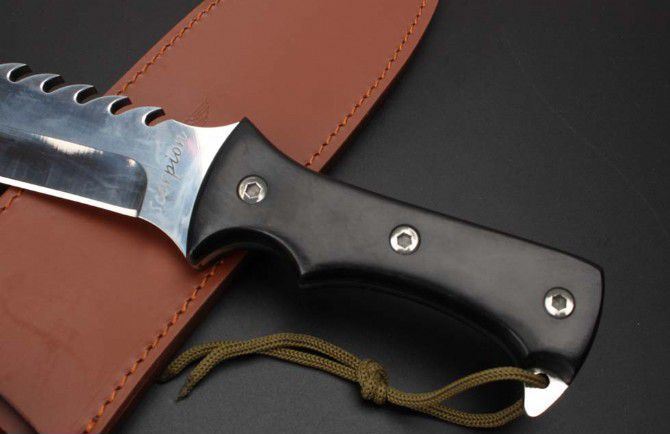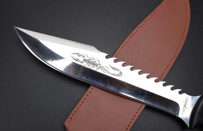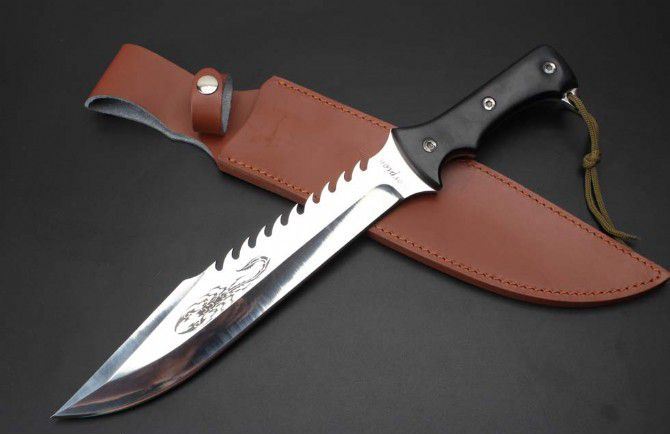魔蝎一体战刀 全 长:42.3cm 刃 长:28.8cm 柄 长:13.5cm 刃 厚:5.5mm 刃 宽:5.3cm 刃 材:7Cr13Wov 表 面:镜光 柄 材:黒木 硬 度:57HRC 净 重:832g(含皮套) 重 量:908克(含包装物)