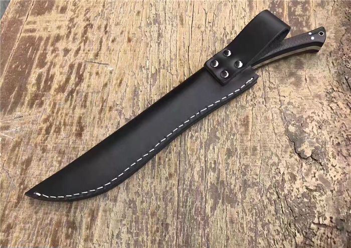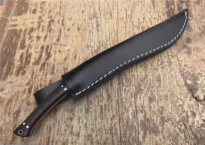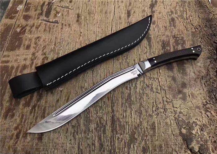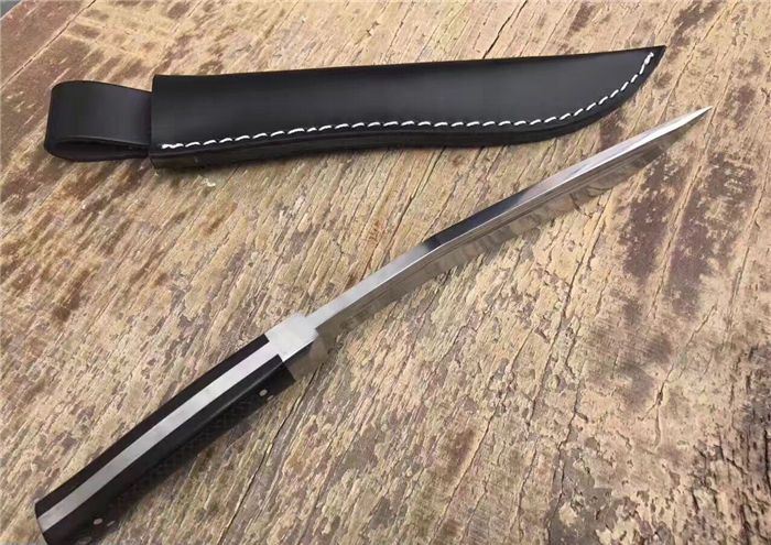 全长:31.8cm 刃长:20cm 柄长:11cm 厚度:6mm 钢材:进口高碳钢 硬度:60-61 柄材:黑檀木 表面:超镜光(一体龙骨) 刀鞘:牛皮刀鞘 毛重:800g(含包装)