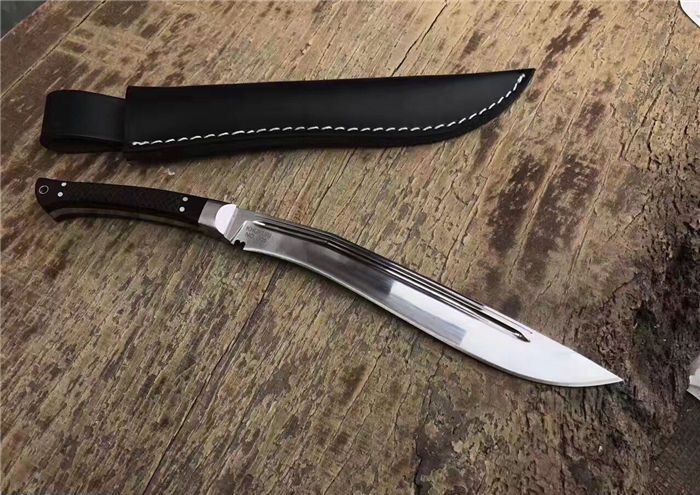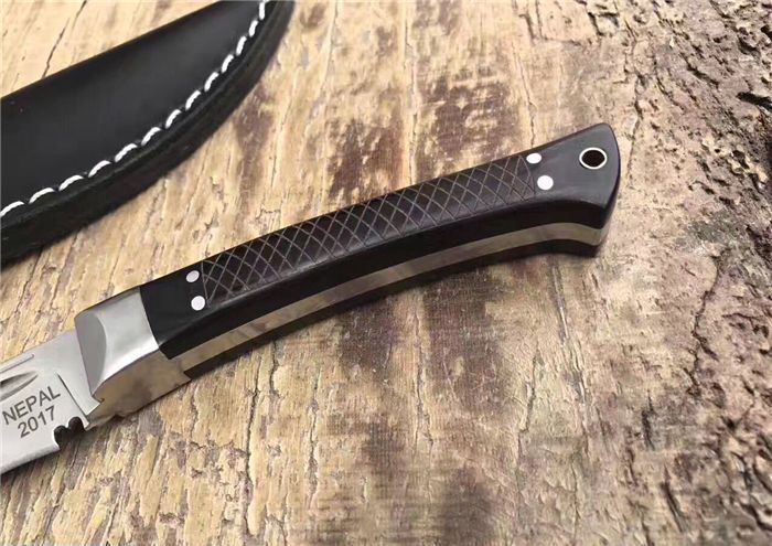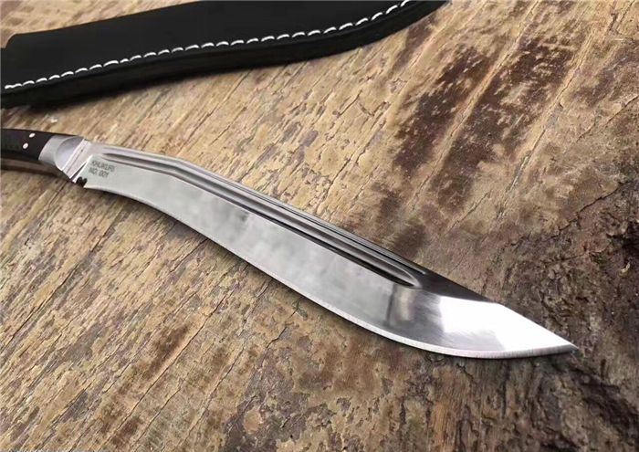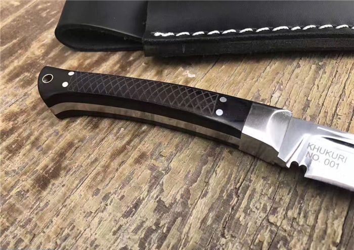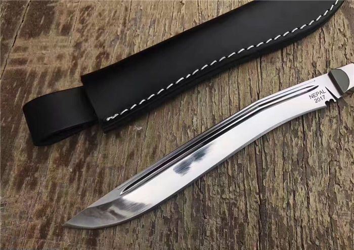 尼泊尔武士一体小狗腿刀镜光 全长:31.8cm 刃长:20cm 柄长:11cm 厚度:6mm 钢材:进口高碳钢 硬度:60-61 柄材:黑檀木 表面:超镜光(一体龙骨) 刀鞘:牛皮刀鞘 毛重:800g(含包装)