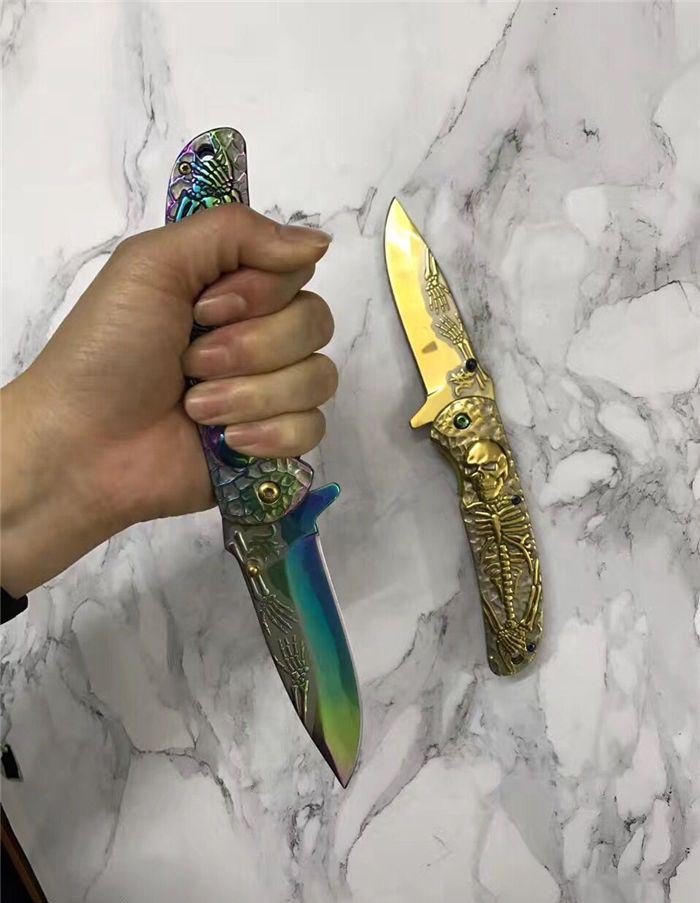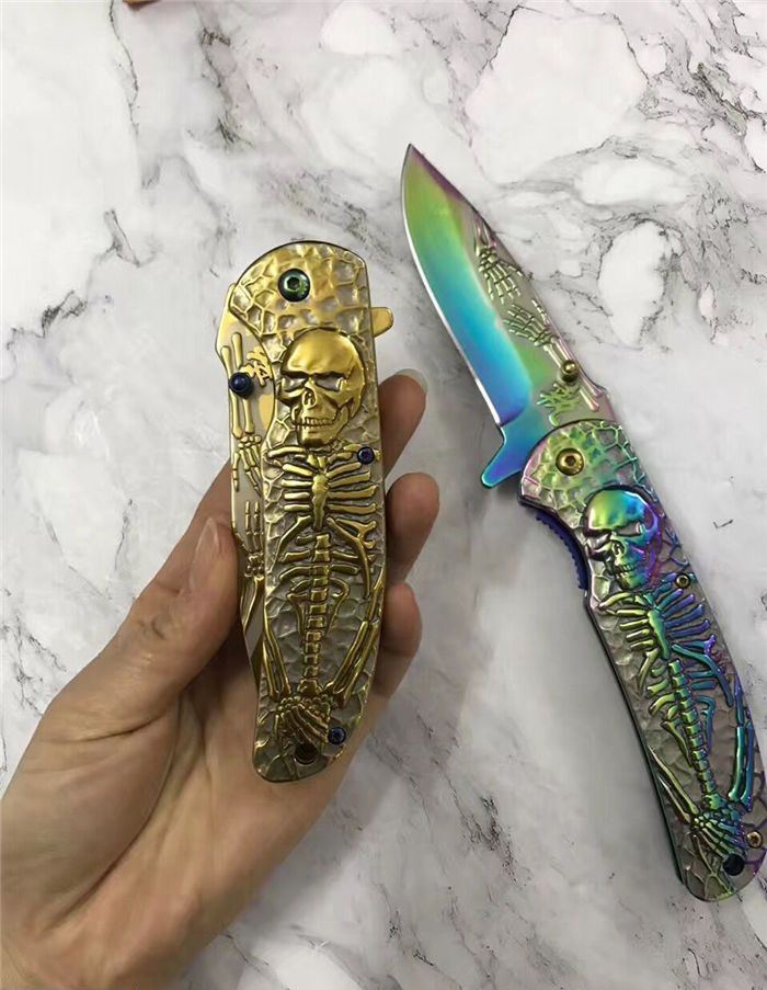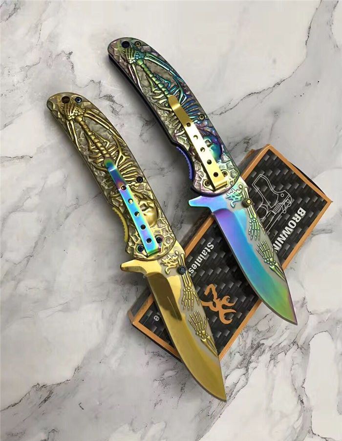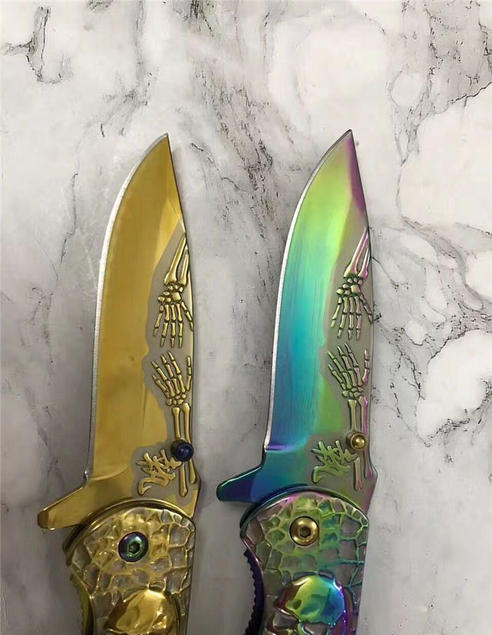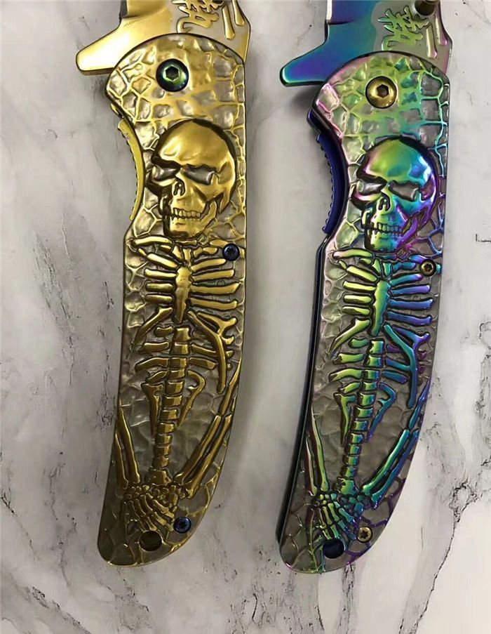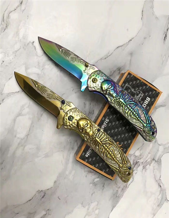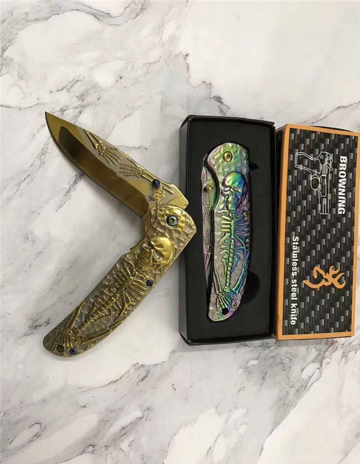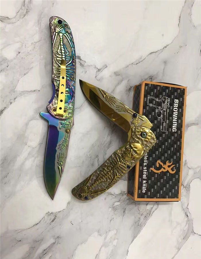 勃朗宁浮雕骷髅快开折刀 全 长:21.7cm 刃 长:9.7cm 柄 长:12cm 刃 宽:2.6cm 刃 厚:0.3cm 刃 材:7Cr13 重 量:260克(含包装) 硬 度:58HRC 表 面:镜面彩钛和金色 柄 材:钢柄 图案浮雕 凸起 锁 型:快开 其 他:配彩盒