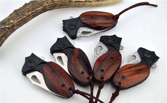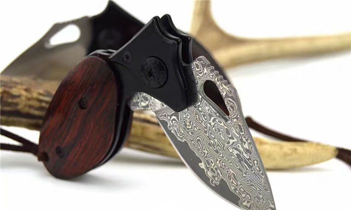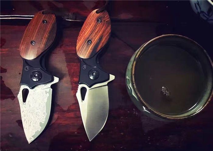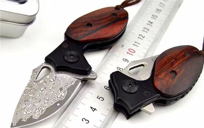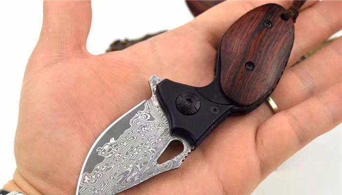 刺鼠大马士革钢快开折刀 打开总长:12.7cm 刃长:5.1cm 刃宽:3.1cm 刃厚:0.29cm 刃材:大马士革钢 硬度:58Hrc 克重:107g 中轴采用滚珠轴承,快开。钢柄电渡黑钛,搭配高端黄檀实木。
