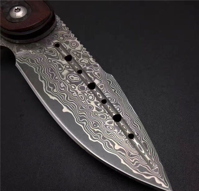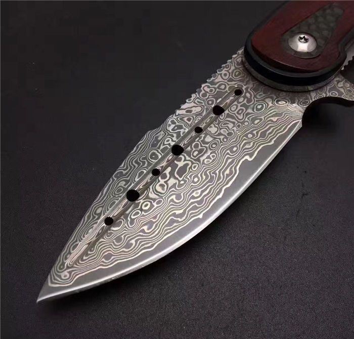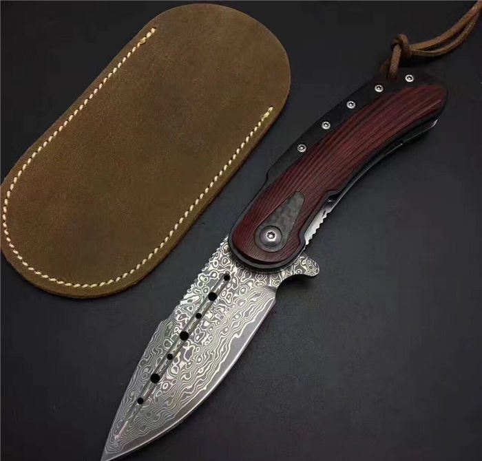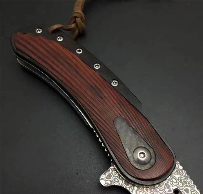手工猛龙战刀升级版大马士革折刀 全 长: 18.0cm 刃 长: 8.0cm 柄 长: 10.0cm 刃 厚: 3.2mm 刃 宽: 2.7cm 刃 材:进口Vg10大马士革钢 硬 度: 59-60HRC 重 量: 约320克(含包装) 表 面: 大马士革锻打祥云花纹原色 柄 材:黑檀木+红科檀木+碳纤+雕花不锈钢底骨 配 送:方形礼品盒+绒布袋或者U型牛皮套+牛皮绳