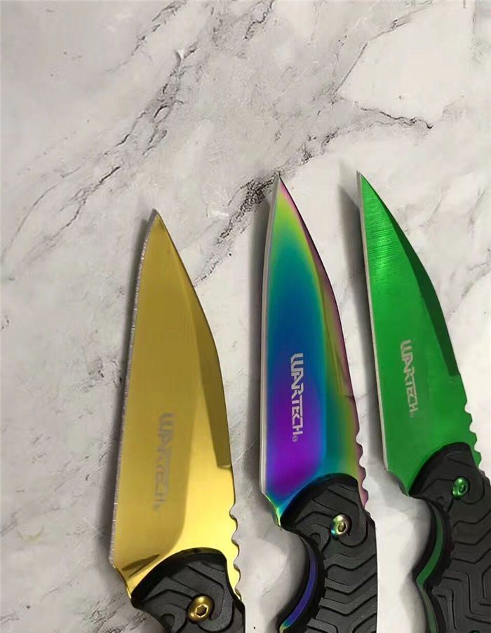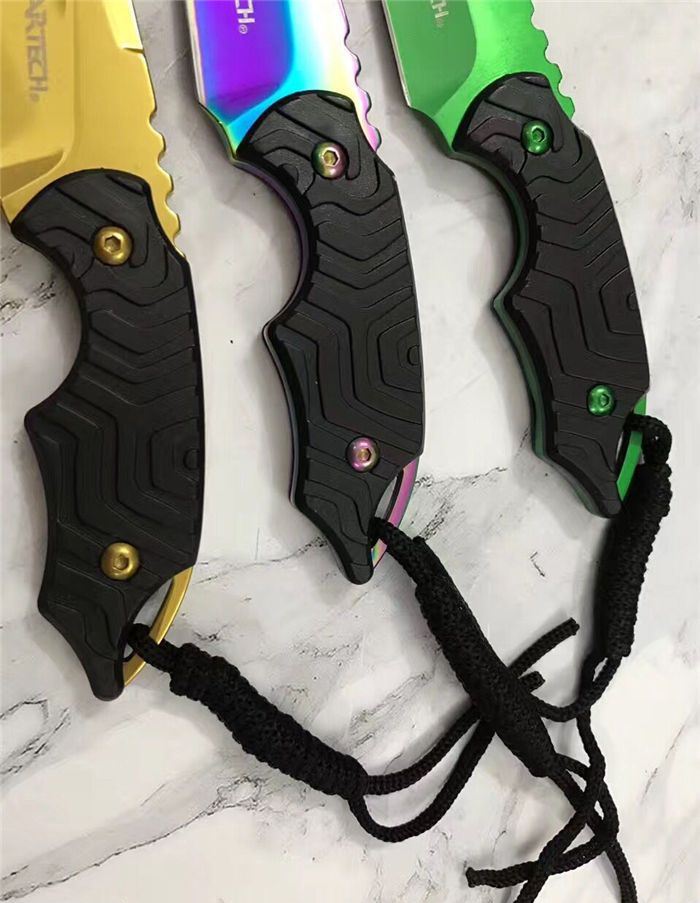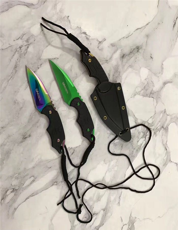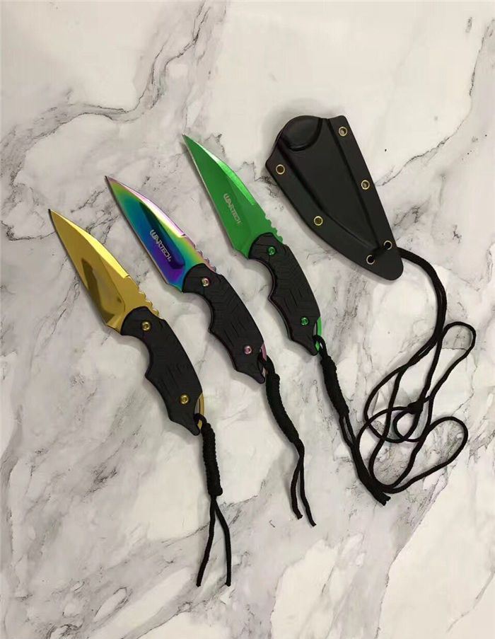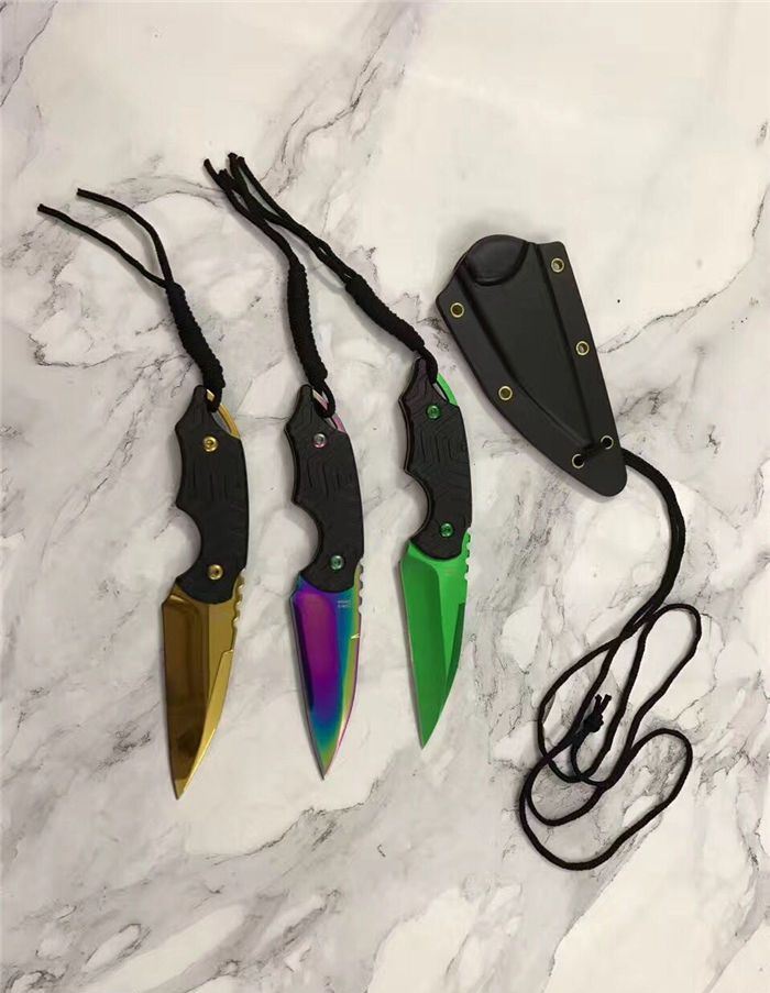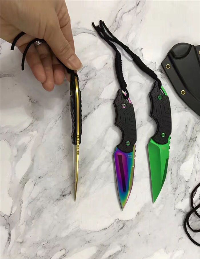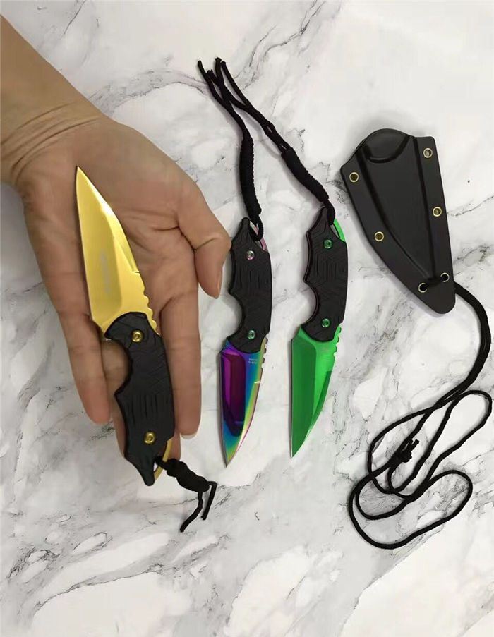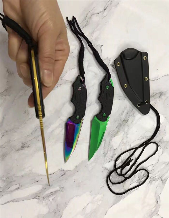 三色迷你手刺 全长:14.8cm 刃长:6.8cm 刃厚:0.3cm 刃材:5cr15 表面:金色 硬度:55 柄材:G10防滑纹 刀鞘:k鞘 重量:80克含包装 锋利度:可以划汉毛