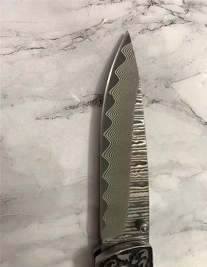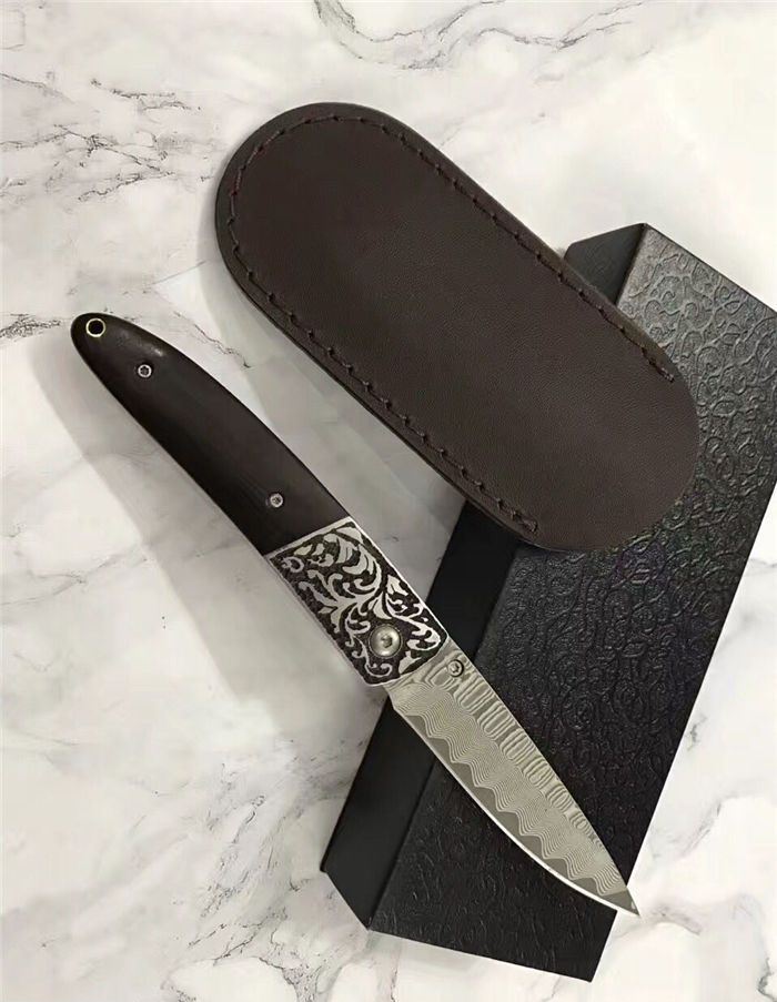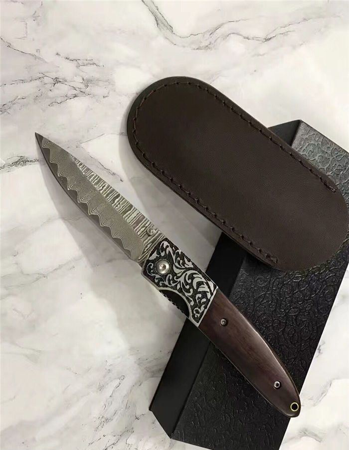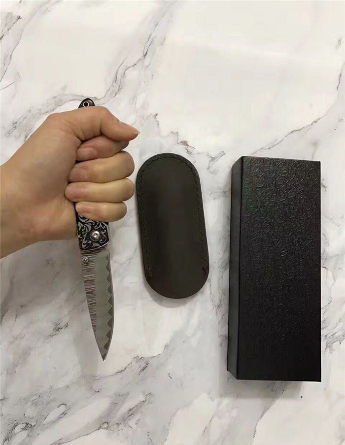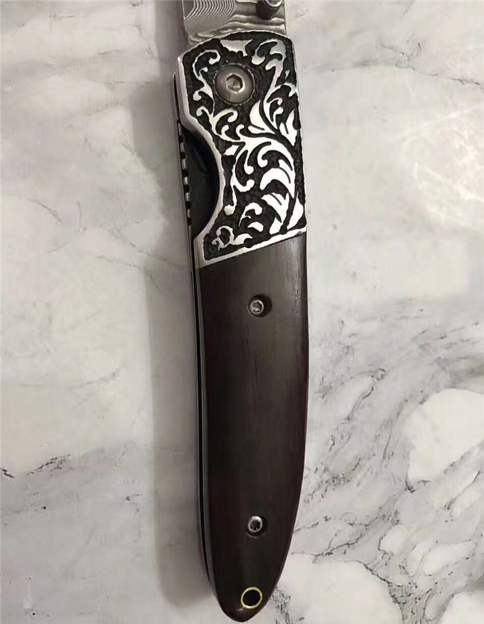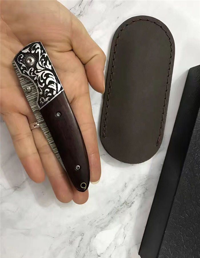 大马士革雕花折刀 全长:19cm 刃长:8.2cm 刃厚:3cm 刃宽(最宽处):20mm 柄长:10.8cm 大马士革钢材,雕刻不锈钢头,紫檀木柄 配送精美礼盒皮套,送礼收藏户外防身佳品