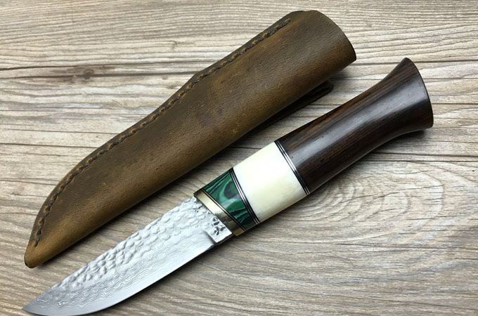 精品四色箭北欧大马士革猎刀 全 长: 22CM 刃 长: 10 CM 刃 宽: 2.6CM(最宽处) 柄 长: 12cm 硬 度: 58-60HRC 刃 厚: 0.3CM 重 量: 约400克(含包装) 表 面: 纯手工制造锻打雨滴祥云花纹原色 刃 材: 正品进口大马士革钢 柄 材: 黄铜+白骨+进口科檀+绿彩石 赠 送: 皮套