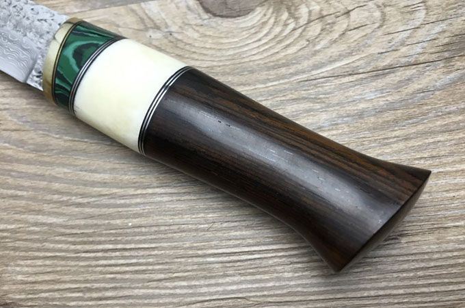 全 长: 22CM 刃 长: 10 CM 刃 宽: 2.6CM(最宽处) 柄 长: 12cm 硬 度: 58-60HRC 刃 厚: 0.3CM 重 量: 约400克(含包装) 表 面: 纯手工制造锻打雨滴祥云花纹原色 刃 材: 正品进口大马士革钢 柄 材: 黄铜+白骨+进口科檀+绿彩石 赠 送: 皮套