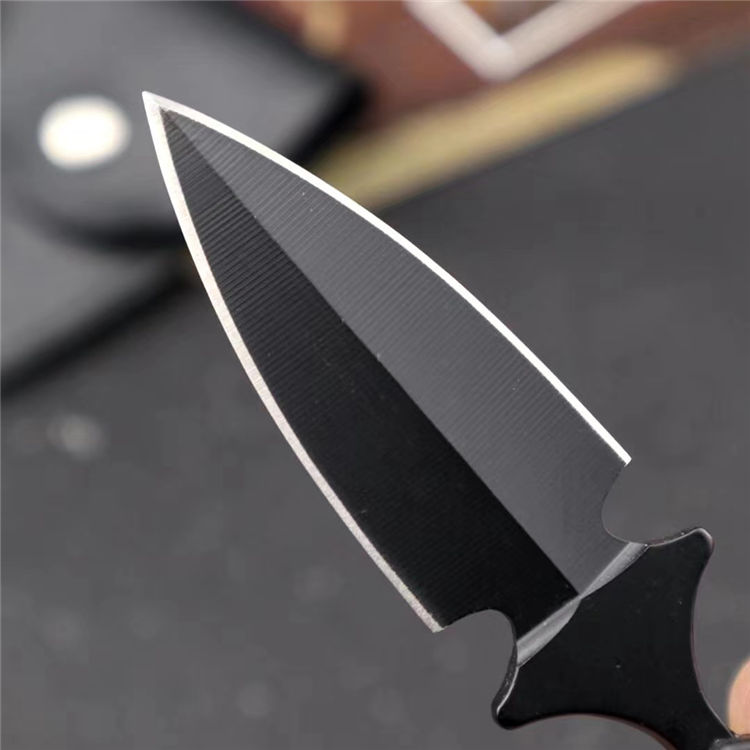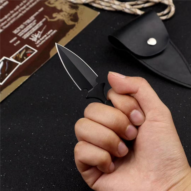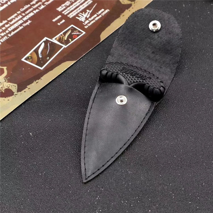 冷钢敢死队手刺黑色 全 长: 9.5cm 刃 长: 4.5cm 刃 宽: 5cm(最宽处) 硬 度: 58HRC 刃 厚: 0.3cm 重 量: 40克(含包装) 刃 材: 440C 表 面: 发黑 包 装: PU套