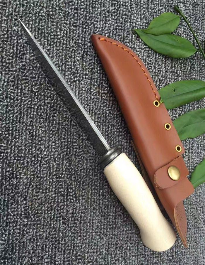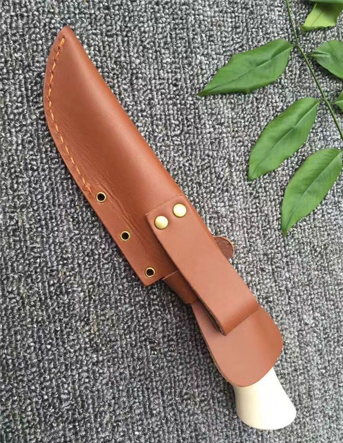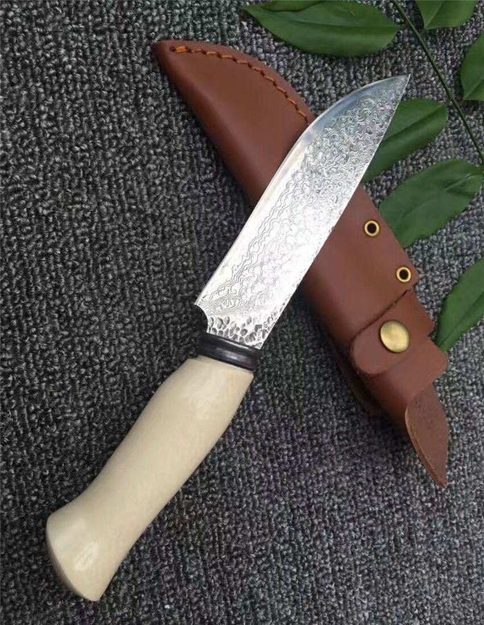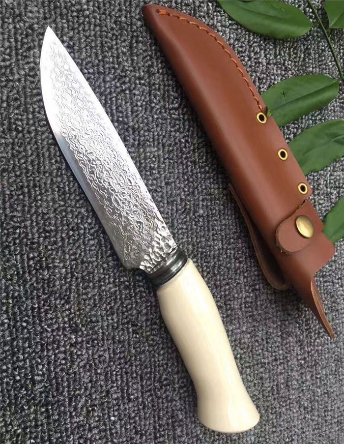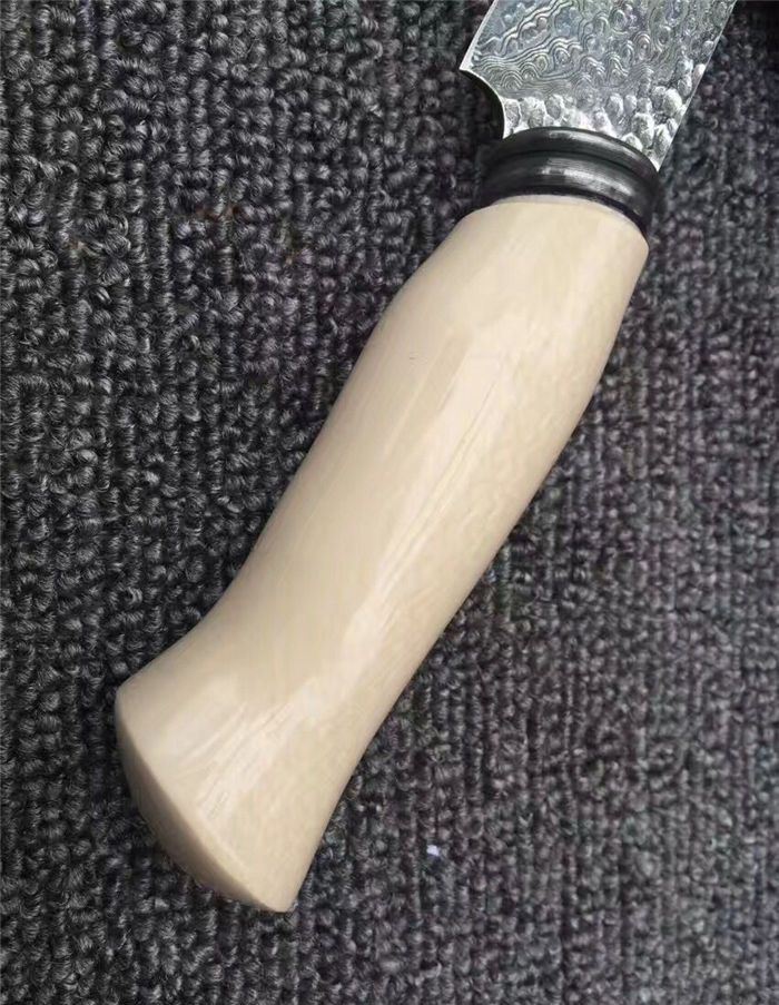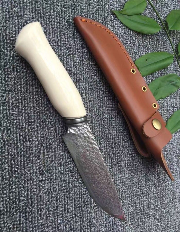 手工版白玉龙大马士革直刀 全长:26.5cm 刃长:14.5cm 柄长:11cm 厚度:5mm 硬度:58HRC 钢材:大马士革刚 柄材:铜头+兽骨 总重量含包装:300G 刀鞘:牛皮刀鞘
