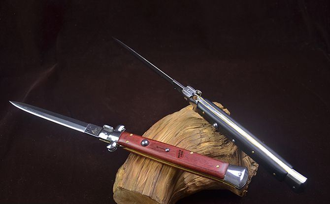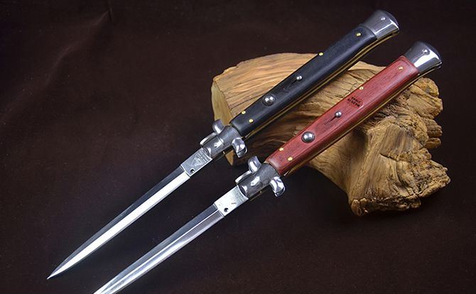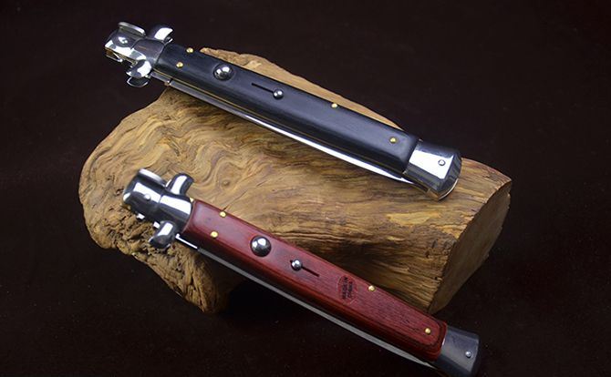 AB款13英寸意大利黑手党使用的经典刀具-赌徒跳刀,13英寸(33CM)特长款,彩木柄的黑手党侧跳,出刀迅速,锁定稳固,具有超强的穿刺力!带有保险装置,刀护手处暗藏闭合开关,别具把玩性,意大利老牌AB商标,功能性完工度不错,满足把玩和收藏的需要