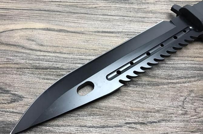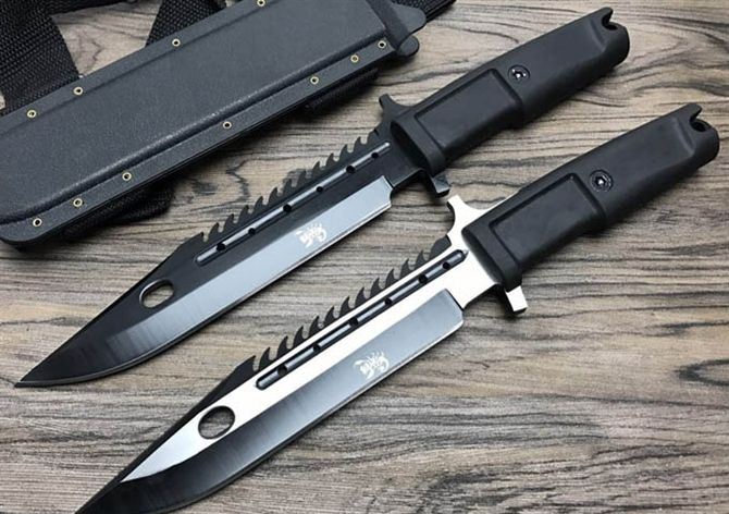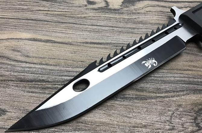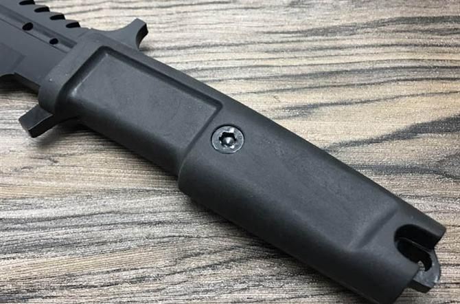 蝎子虎牙直刀 全 长:31cm 刃 长:18cm 刃 厚:6mm 刃 材:8CR13MOV 硬 度:58HRC 表 面:拉丝,黑钛 柄 材:橡塑 刀 鞘:ABS
