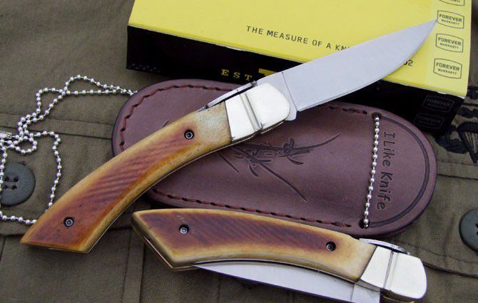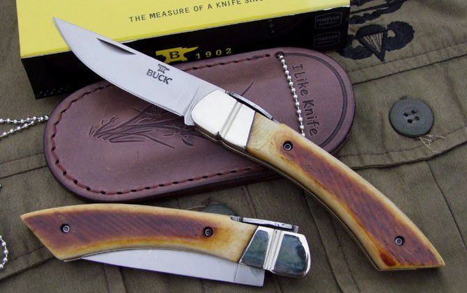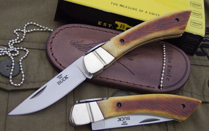巴克BUCK鑫刃II兽骨柄+白铜(不配皮套) 全长:19cm 刃长:7.6cm 刃厚:3mm 刃材:8CR17Mov 硬度:59HRC 表面:磷化 柄材:兽骨+黄铜 净重:131g 刀套:牛皮 锁定:自动锁