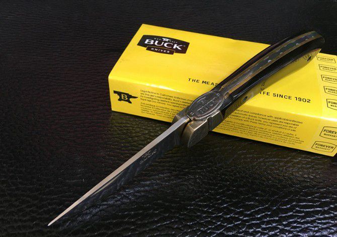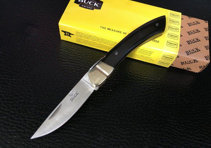 巴克BUCK鑫刃III黑牛角+白铜折刀 全长:19cm 刃长:7.6cm 刃厚:3mm 刃材:8CR17Mov 硬度:59HRC 表面:砂光 柄材:黑牛角+黄铜 净重:131g 锁定:自动锁