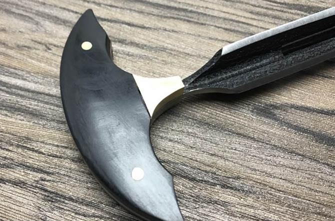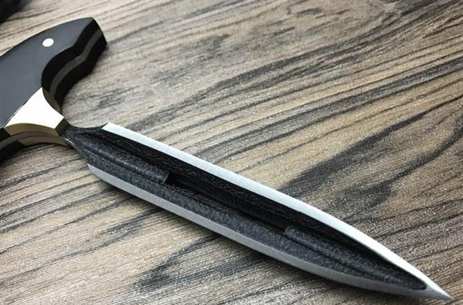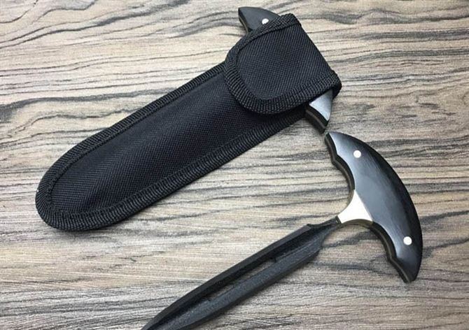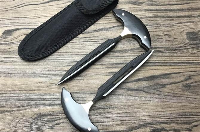 新版敢死队三棱手刺 全长:16.2 刃长:10.4 刃宽:1.7 刃厚:0.3 重量:200g 刃材料:钢 柄材料:黑木 表面:特氟龙粗砂漆