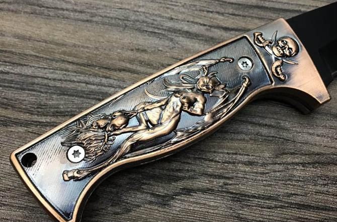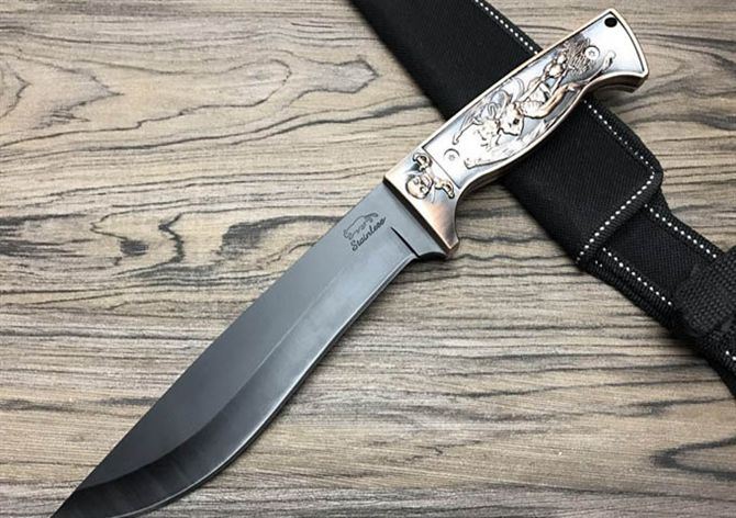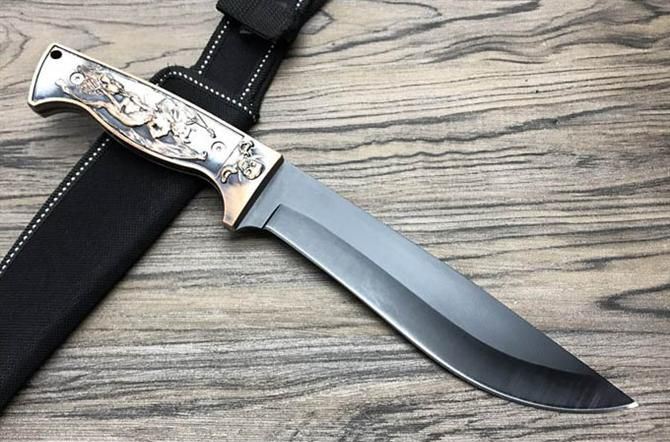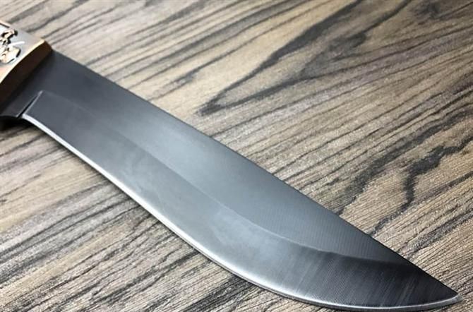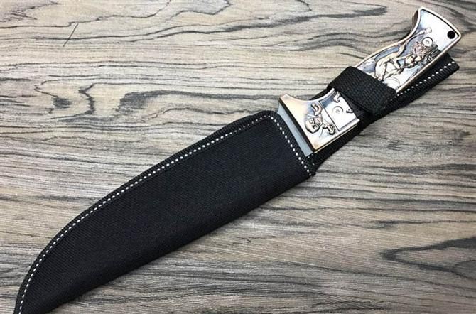夜狼民族刀 全 长:30.5cm 刃 长:18.5cm 刃 宽:3.5cm(最宽处) 刃 厚:3.4mm 柄 长:11.5cm 表 面:发黑 刃 材:3CR13 硬 度:57HRC 柄 材:仿古铜 重 量: 300克(含包装) 包 装:尼龙套