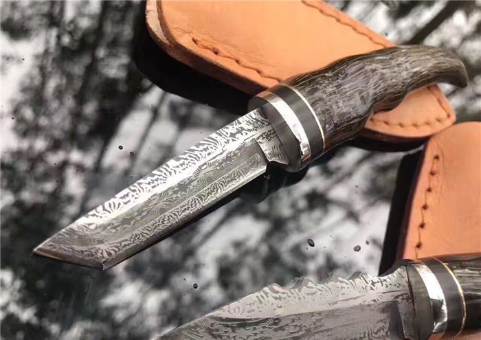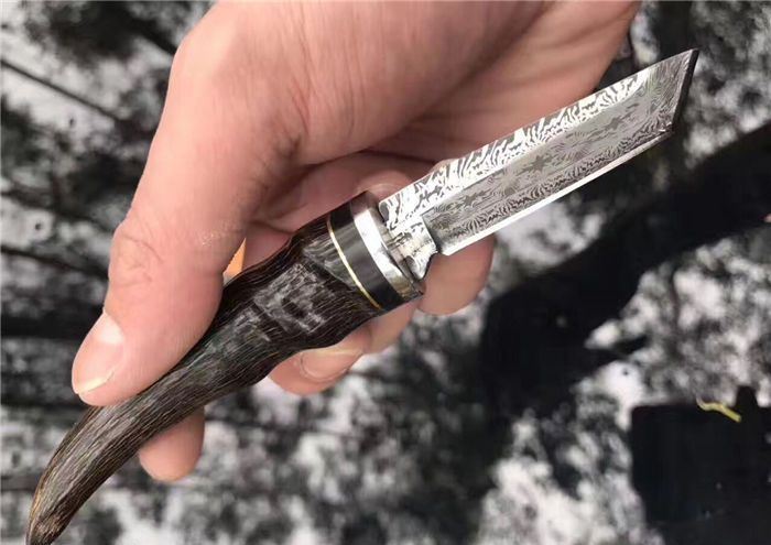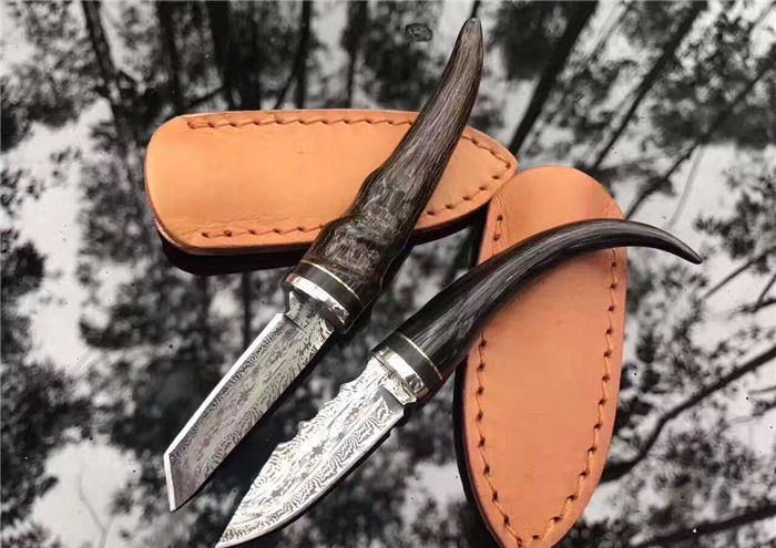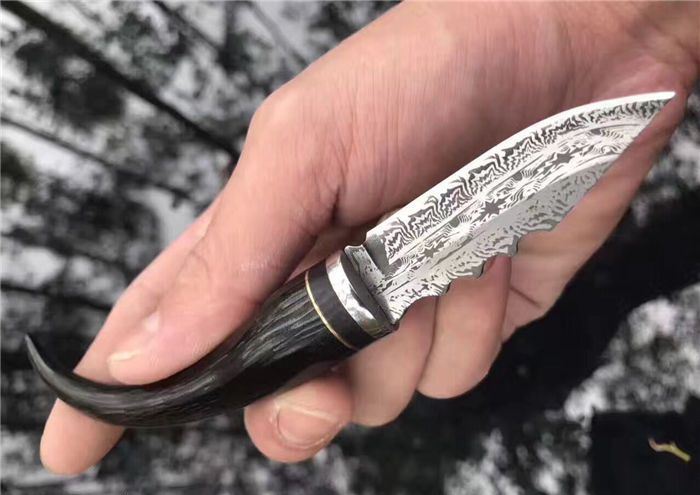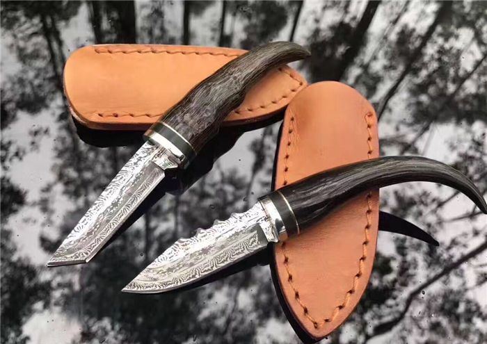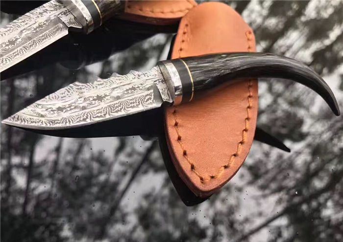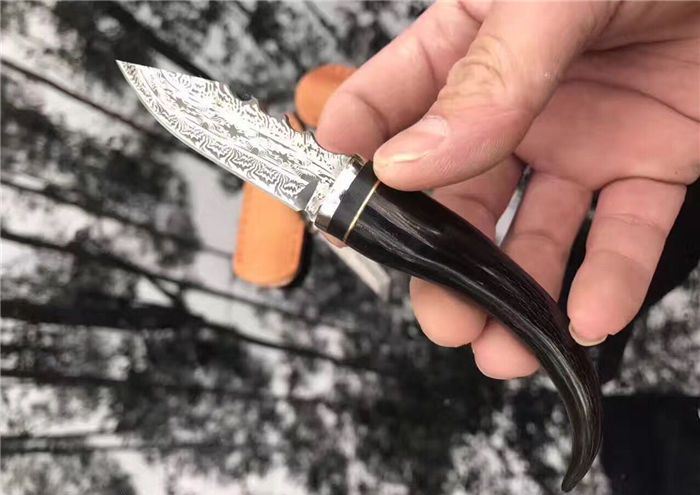 黄羊角大马士革茶刀 全长:19cm 茶刃长:5.5cm 钢材厚度:2.7mm 茶刃钢材:锻打大马士革无芯钢 硬度:59HRC 手柄材料:天然黑羊角(黄羊角)