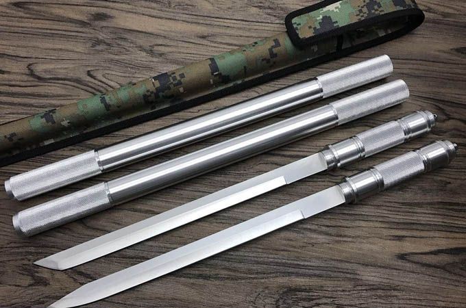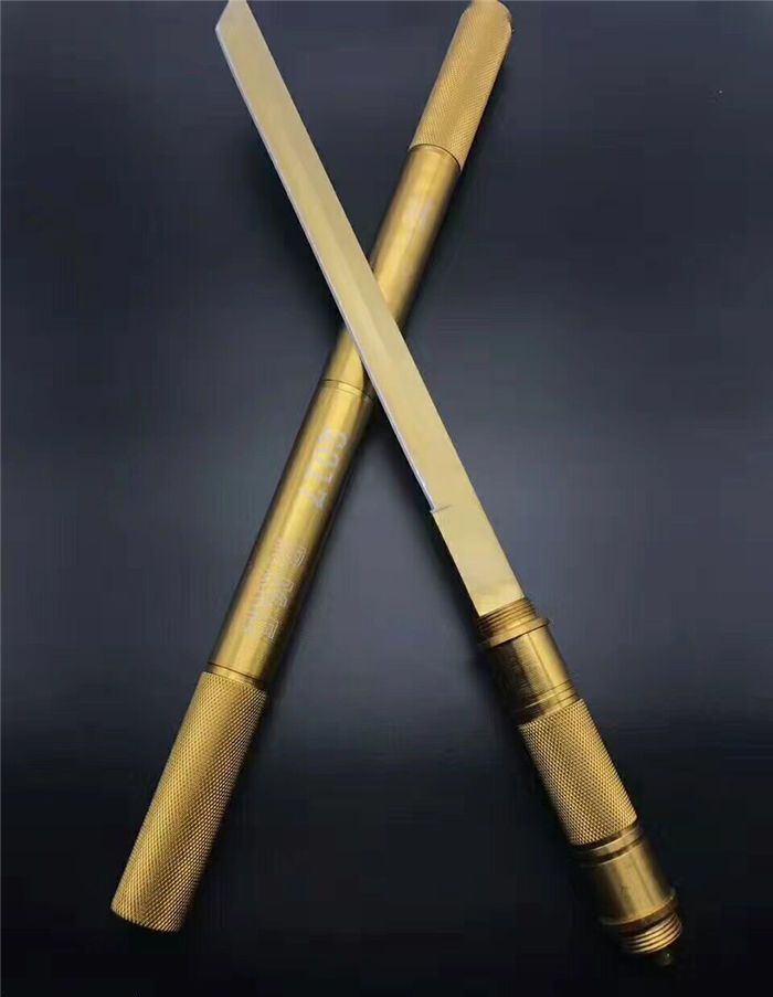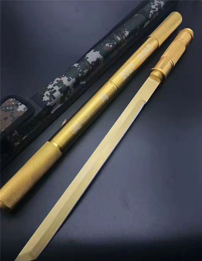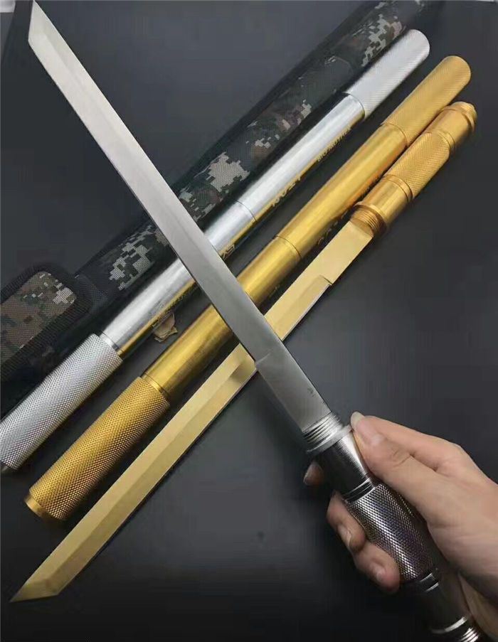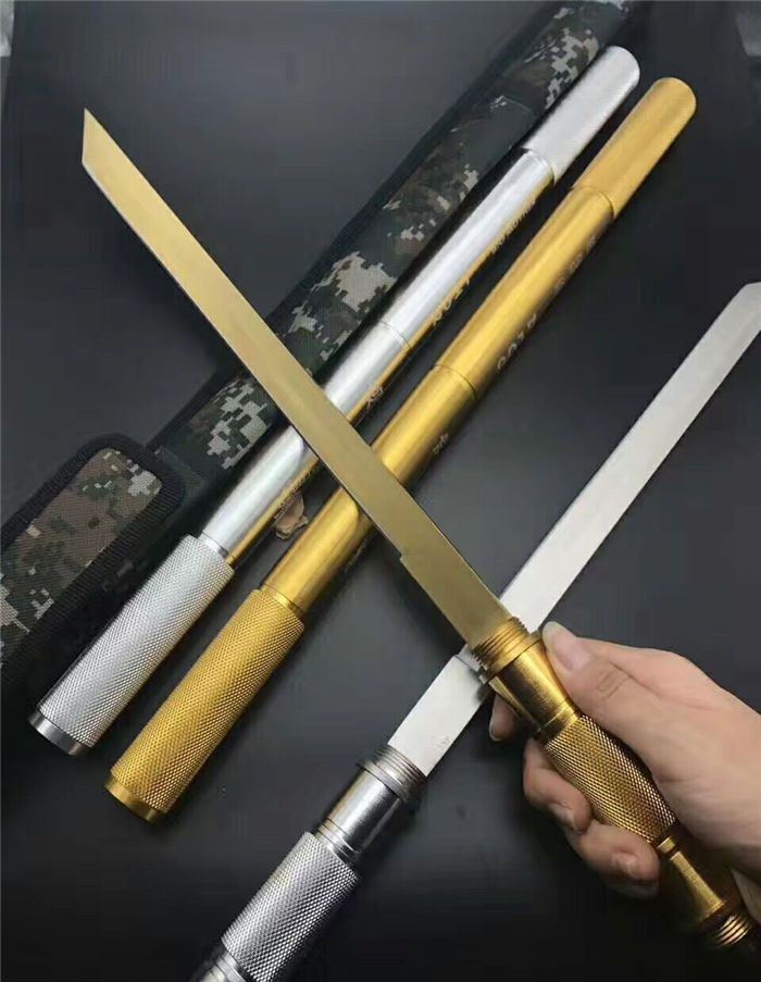 小号铝管组合警棍博击刀白色、金色 全长:54cm 刃长:29cm 接长:83cm 管径:2.6cm 刀厚:0.3cm 刃宽:1.9cm 重量:600g(含包装) 刃材:5Cr13Wov 砂光 管材:铝管 柄材:合金铝 硬度:56HRC 配件:高档耐磨加厚尼龙套(绿色迷彩)