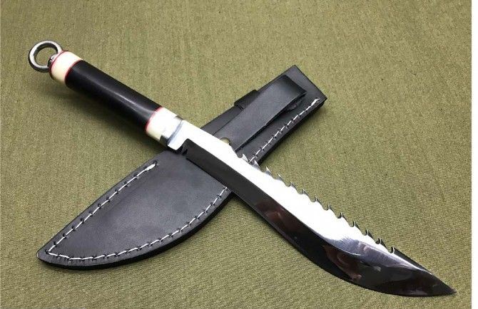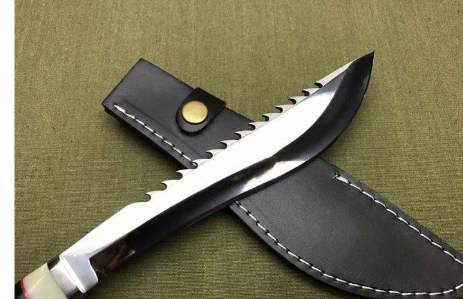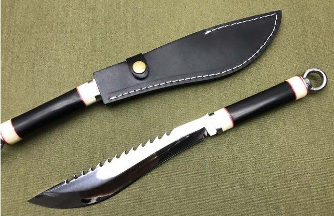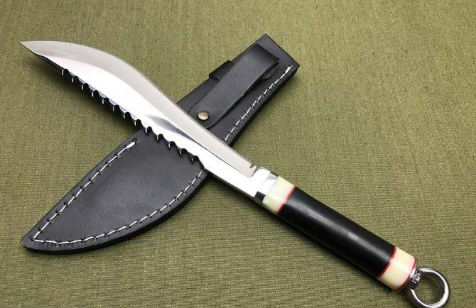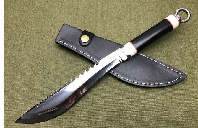 蒙古小捕头背齿手环刀 全长:34.2cm 柄长:13.4cm 刃长:20.8cm 厚度:0.5cm 宽度:3.6cm 刃材:高碳钢 硬度:58-60 重量 .370g 含包装 刀面:超镜光面 柄材:仿牛骨 刀鞘:皮套