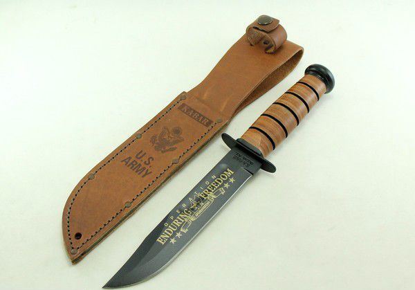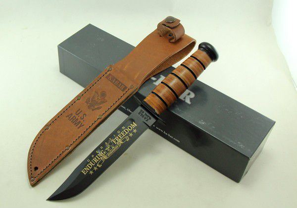 卡巴KaBar9168美国陆军阿富汗持久自由行动纪念版 刃材:1095高碳钢 柄材:真皮压制 全长:30.2厘米 刃长:17.8厘米 刃厚:0.42厘米 硬度:57-58HRC 重量:320克 品牌:美国 产地:美国 刀鞘:原厂刀鞘
