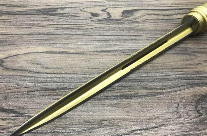 太空二号麻花三棱刺 竹节三棱 全长:39.7cm 刃长:24.2cm 刃厚:2cm 刃宽:2cm 刃厚:2cm 刃宽:2cm 材质:合金钢 刀鞘:铝 重量:900g含包装