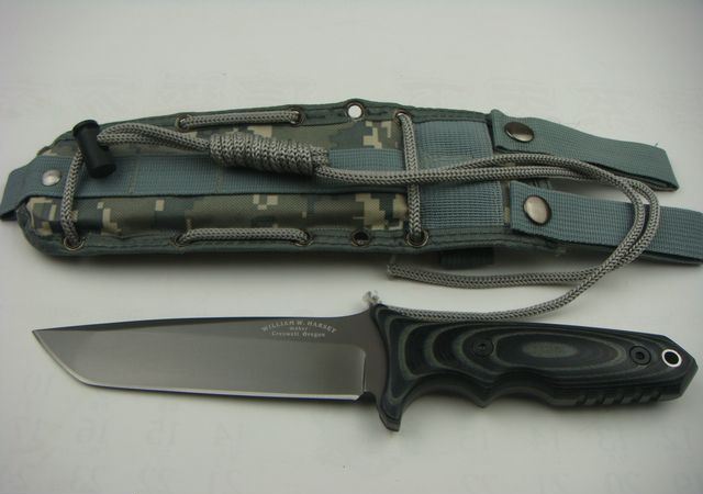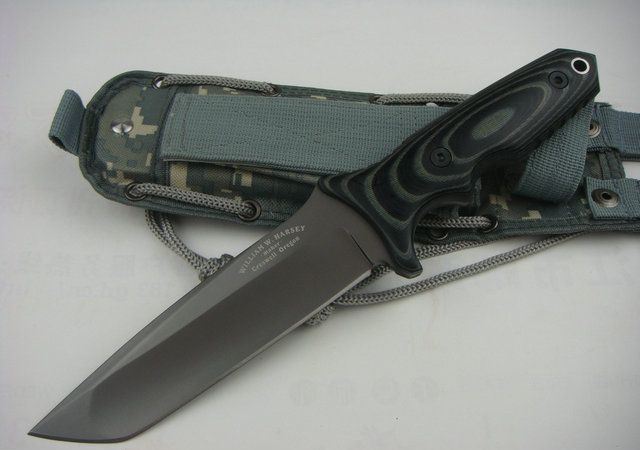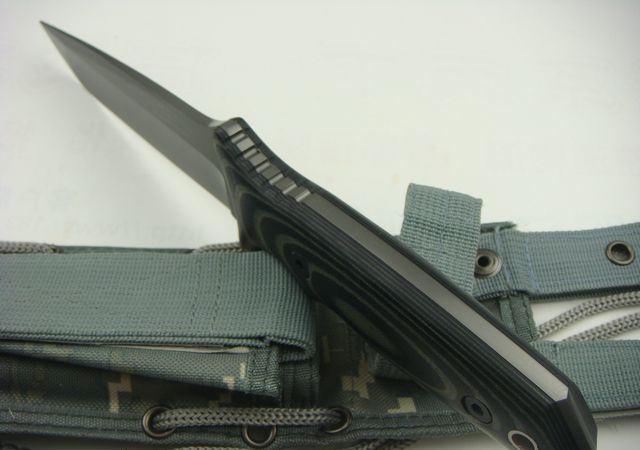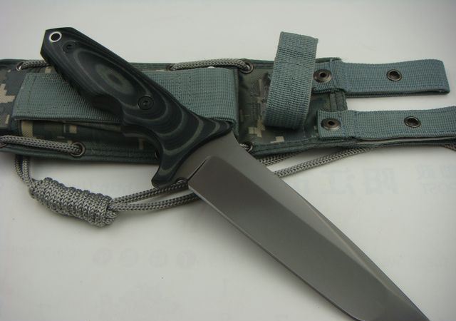 威鹏野外战刀 全 长:28.8cm 刃 长:15cm 柄 长:14cm 刃 宽:3.6cm(最宽处) 刃 厚:5.2mm 刃 材:9Cr13 硬 度:59-60HRC{真空热处理) 刀 柄:米卡塔 表 面:镀钛 重 量:340克 总 量:510克 备 注:带尼龙套