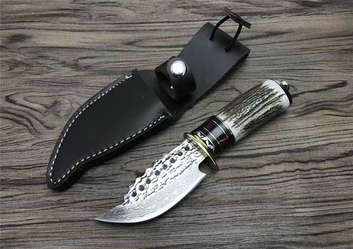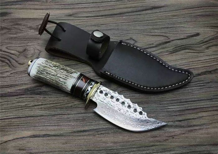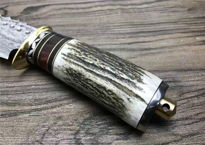 大马士革森林犀牛直刀 总 长: 21.8cm 刃 长: 10.4cm 柄 长: 11.2cm 刃 宽: 4.1cm(最宽处) 硬 度: 59HRC 刃 厚: 0.4cm 柄 材: 天然鹿角 重 量: 255克含包装 刃 材: 大马士革锻打祥云花纹原色 表 面: 大马士革纹 其 他: 纸盒,真皮套