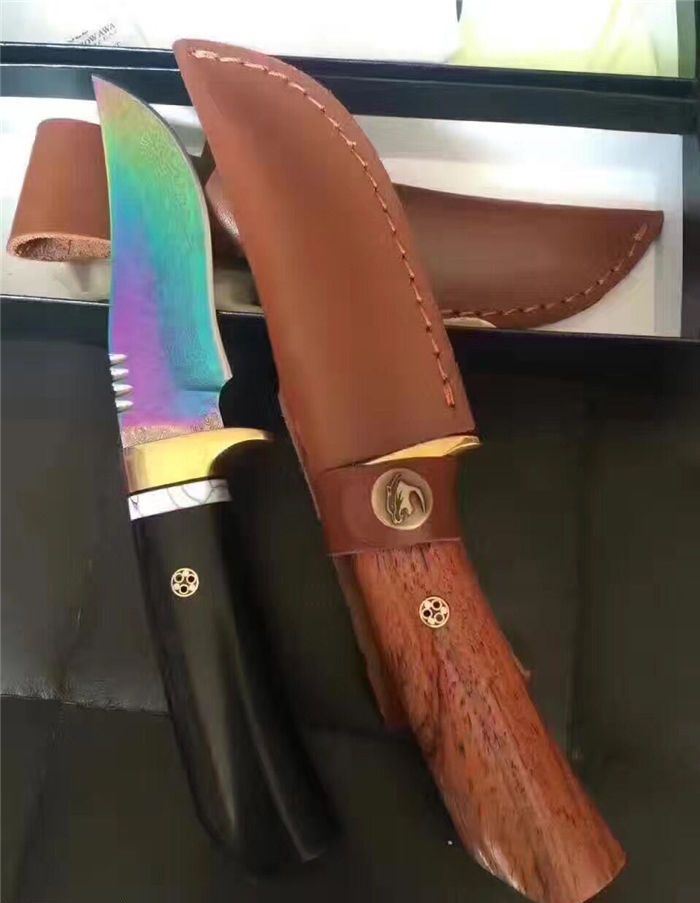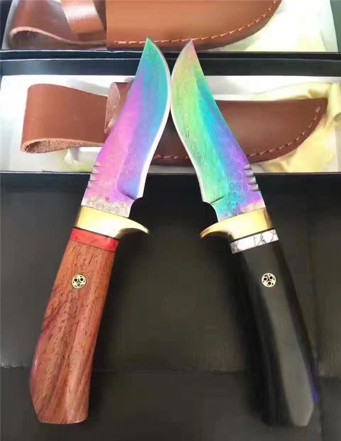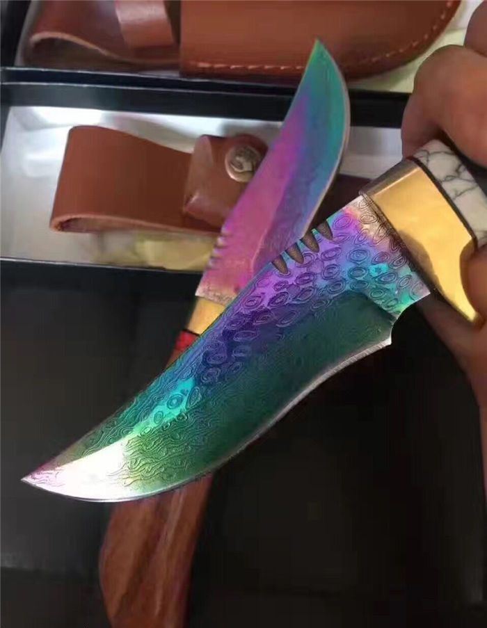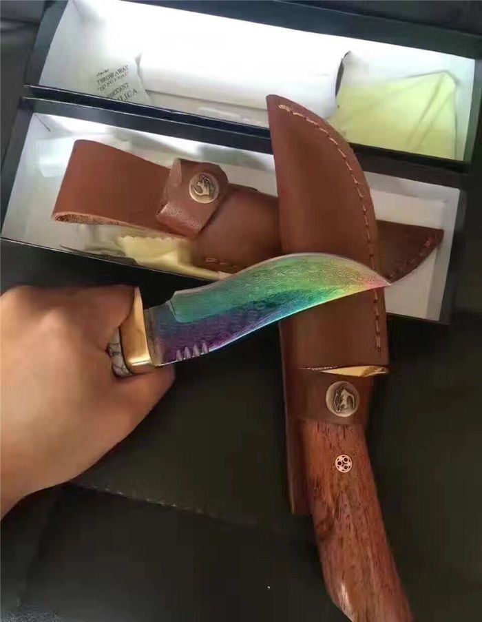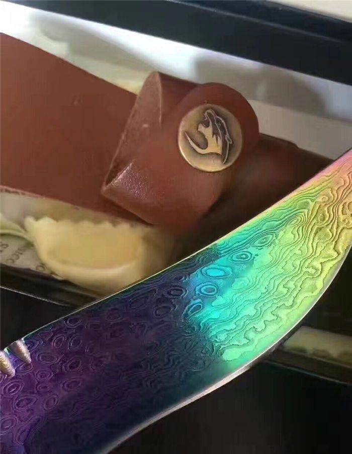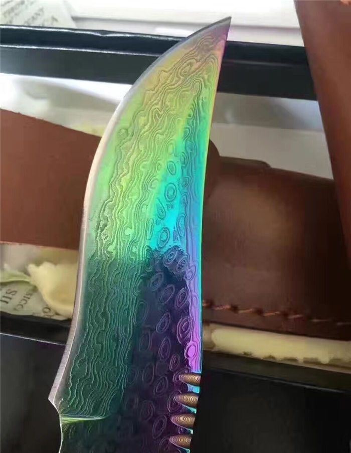 炫彩螳螂大马士革直刀 全 长: 22cm 刃 长: 11cm 柄 长: 11cm 刃 宽: 3cm(最宽处) 硬 度: 59HRC 刃 厚: 0.3cm 柄 材: 野生黑羊角 重 量: 200克 刃 材: 雨滴纹手工锻打大马士革钢 表 面: 大马士革炫彩雨滴纹 其 他: 配礼品盒,真皮套