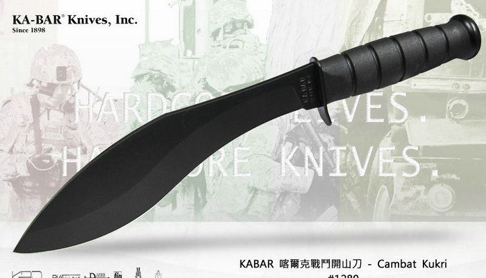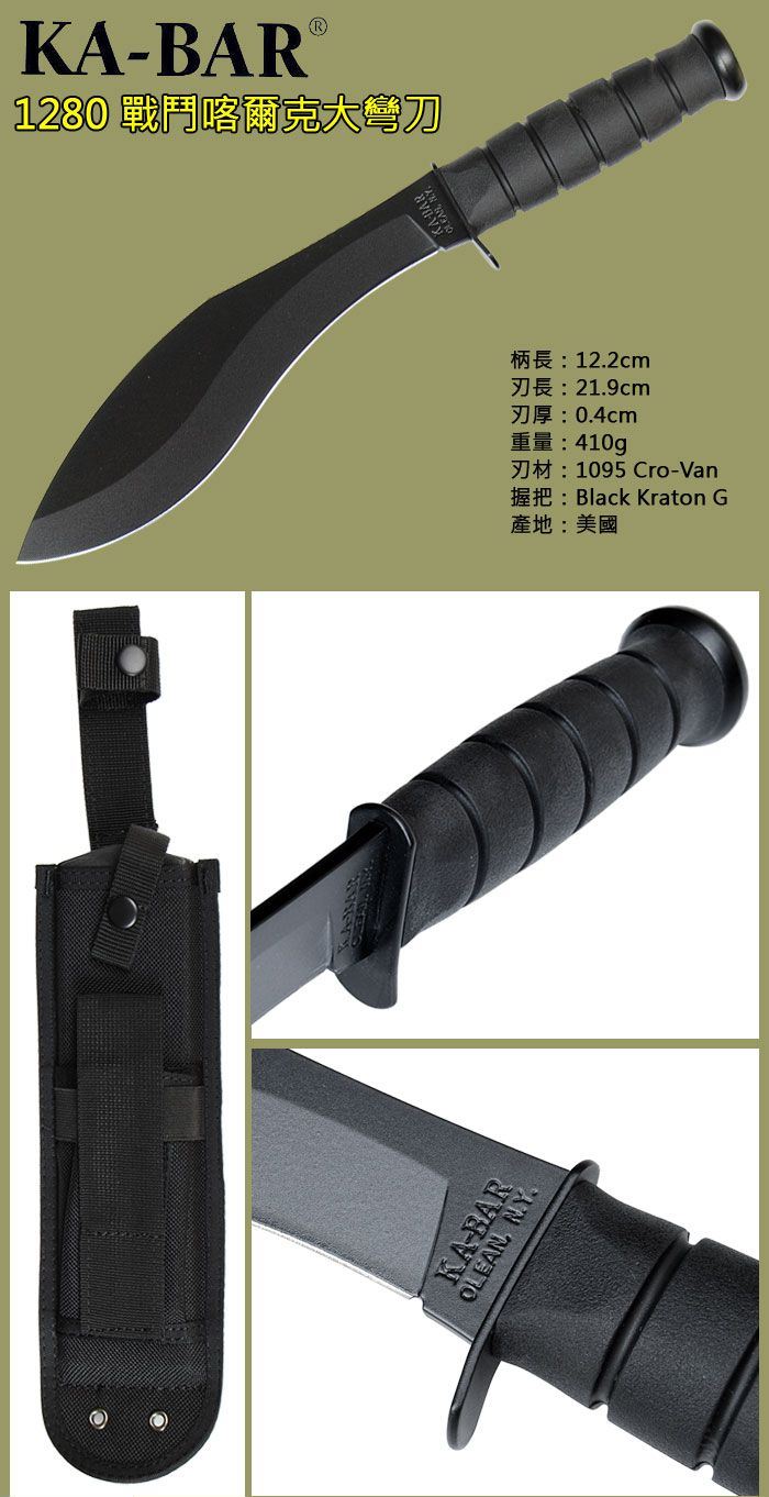 卡巴Kabar1280短款狗腿库克锐开山刀 刃材:1095高碳钢 柄材:克拉通材质 全长:33.9厘米 刃长:21.6厘米 刃厚:0.4厘米 硬度:56-58HRC 重量:362克 品牌:美国 产地:美国 刀鞘:尼龙鞘(中国)