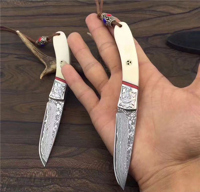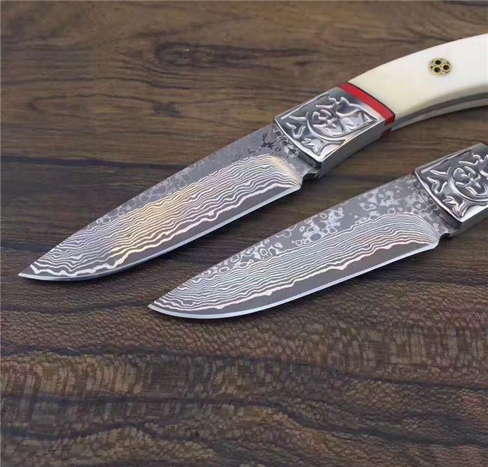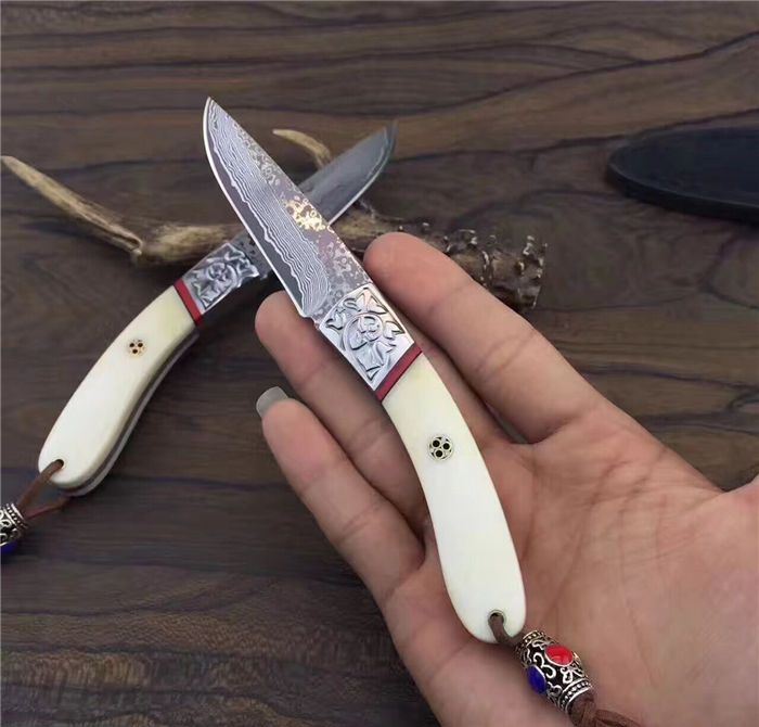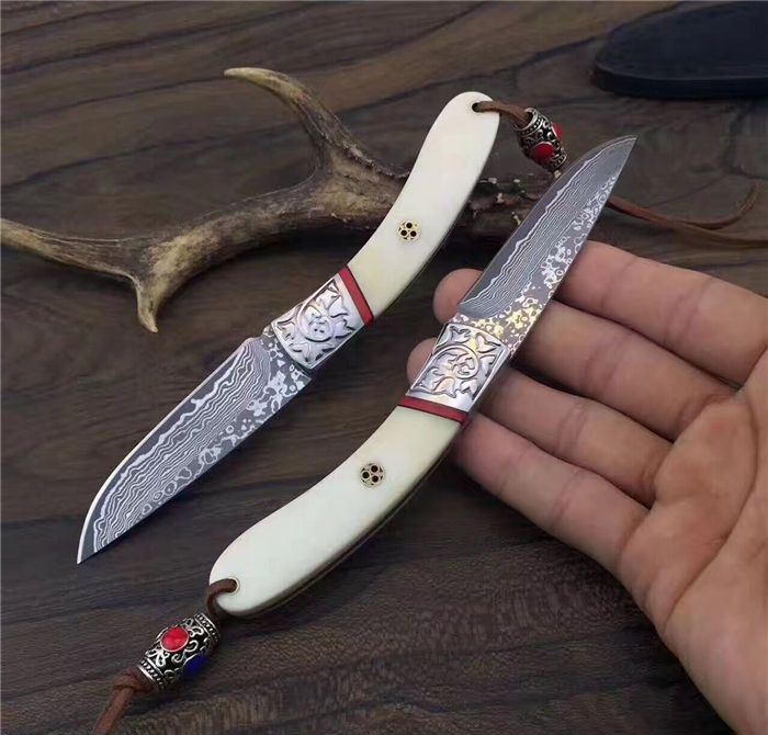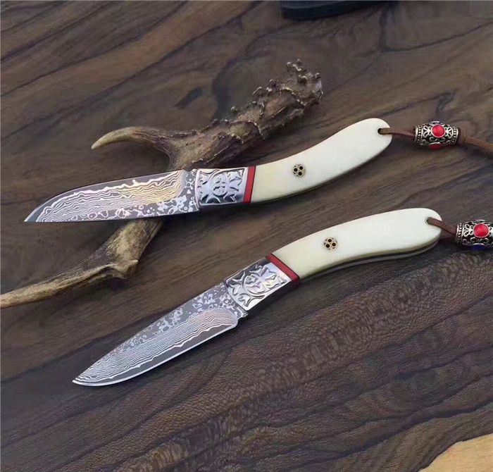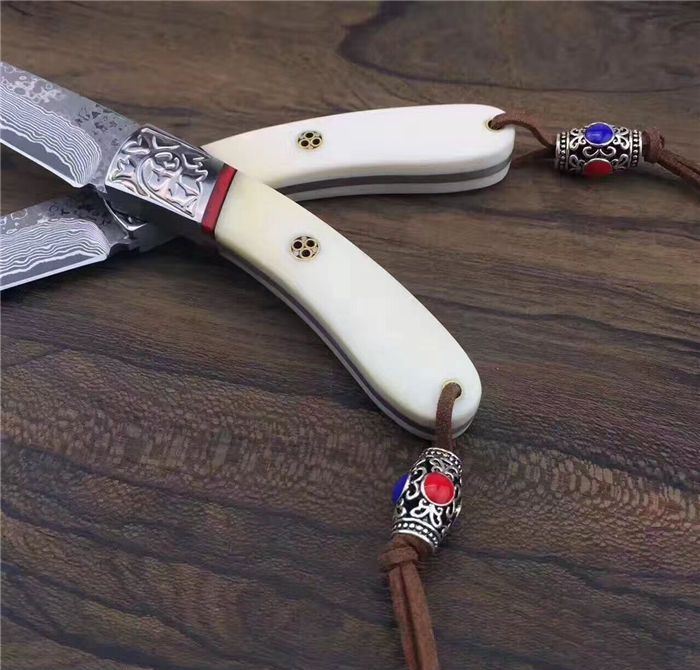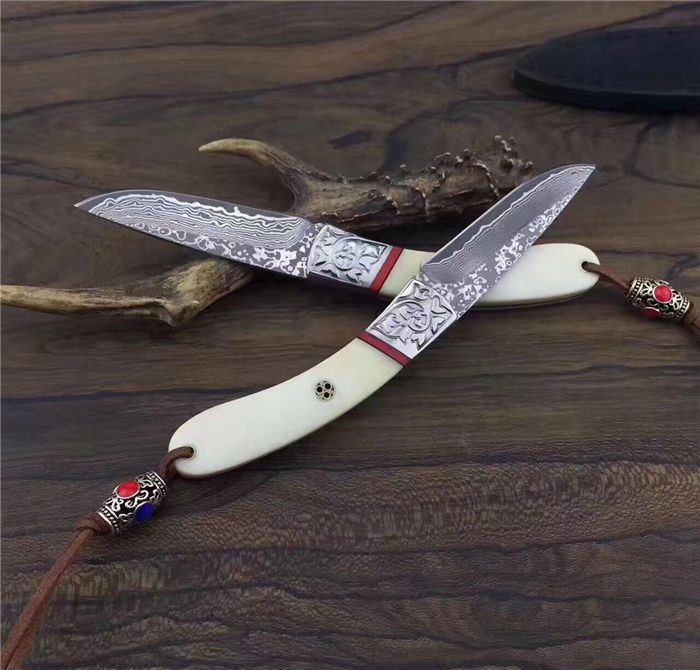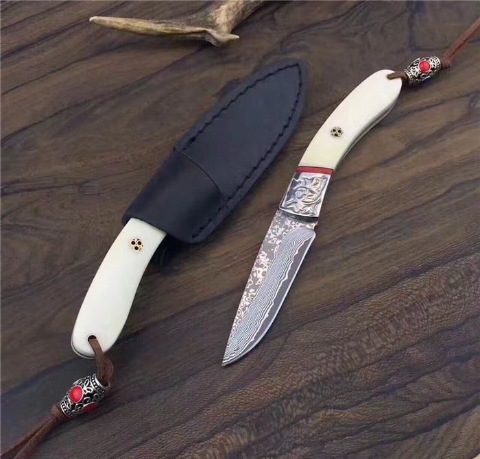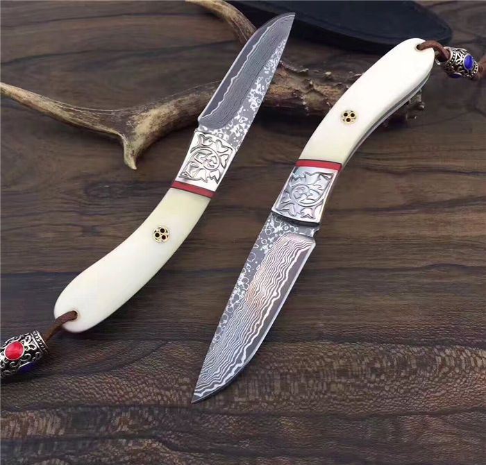 经典淑女大马士革小刀 全长:17.5cm 刃长:7.5cm 刀刃厚度:2.8mm 硬度:59HRC 钢材:大马士革钢 手柄材料:白钢头雕花+牛骨 尾部吊坠七彩福珠 配牛皮刀套、精美礼盒包装