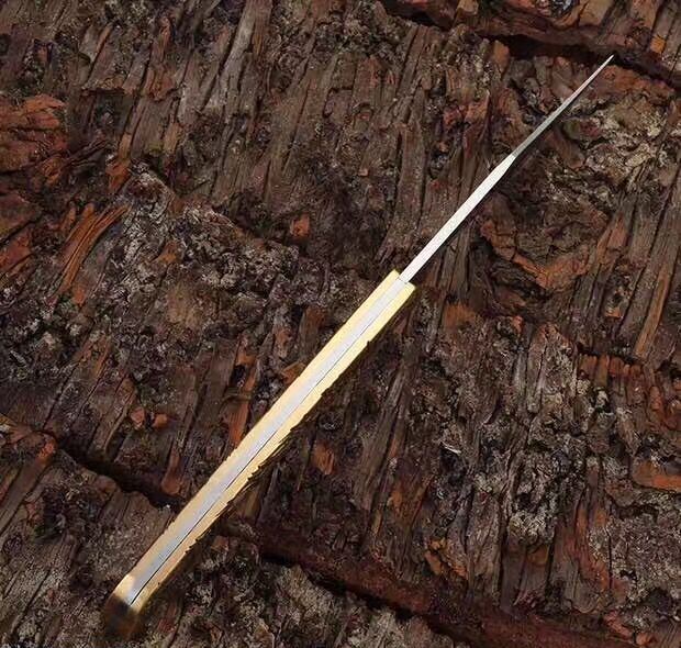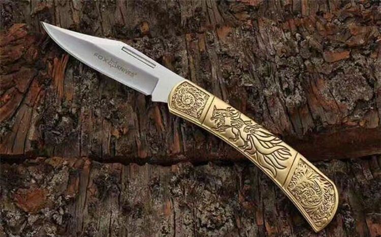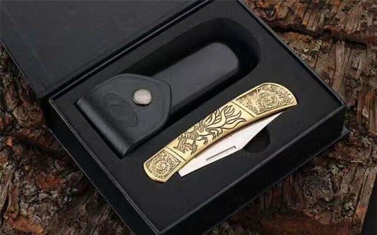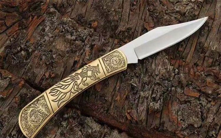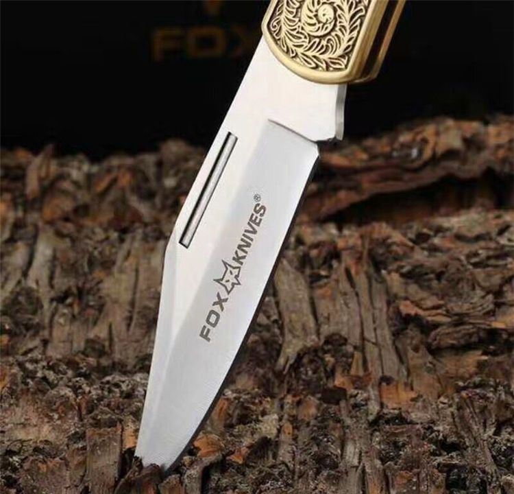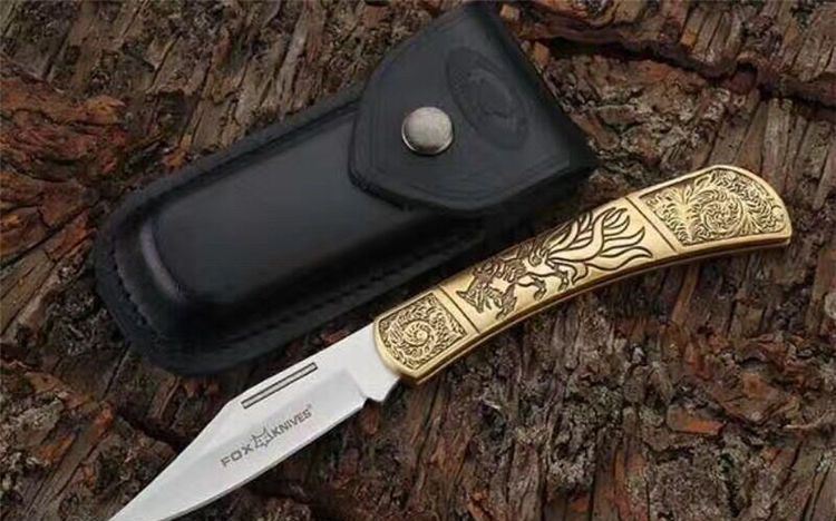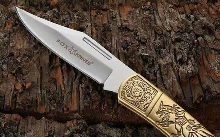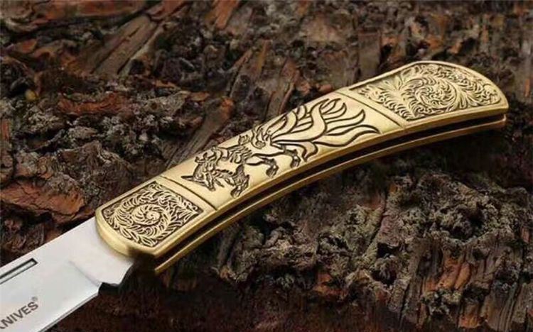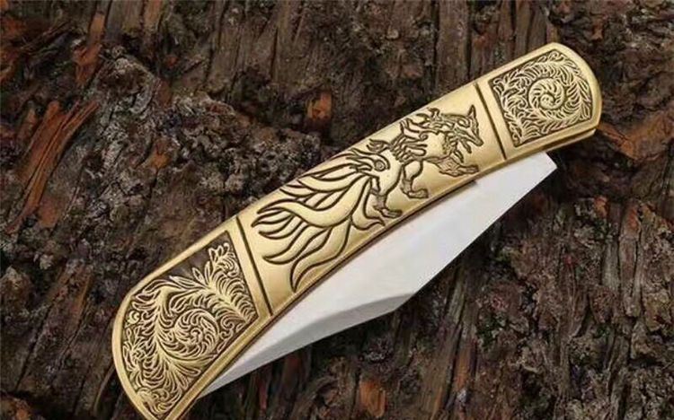 九尾狐折刀 全长:22 刃长:9.6 刃材料 进口440C(美产) 刃厚:0.35宽刃口特锋利 硬度:59-60(实测硬度) 手柄:一体黄铜 其它:精美包装,皮套