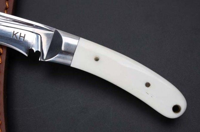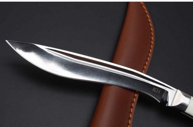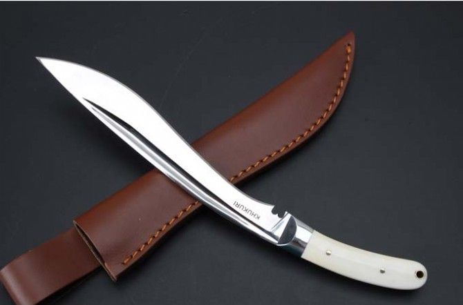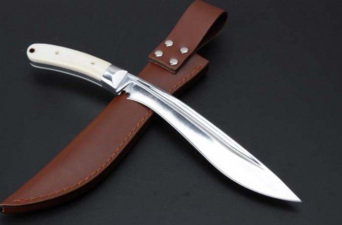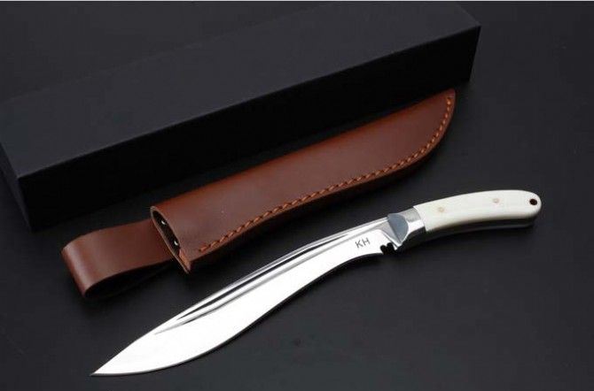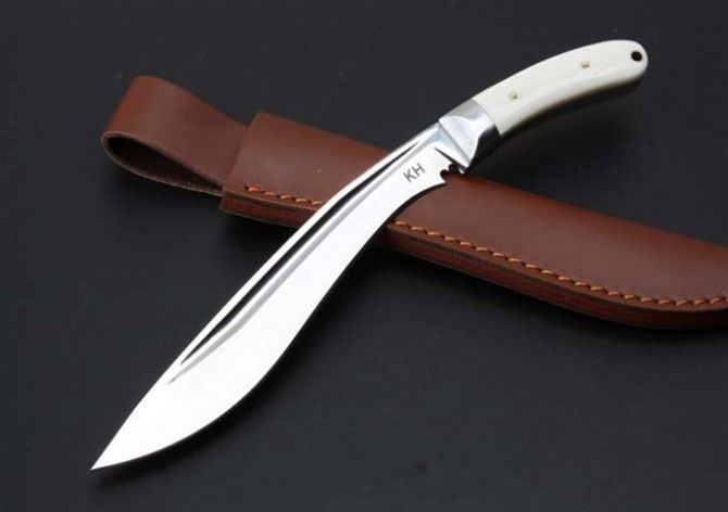 廓尔喀窈窕淑女小狗腿仿牛骨 全长:28cm 刃长:18cm 柄长:10cm 厚度:6.0mm 硬度:60+- 钢材:9CR18MOV (锻打) 柄材:仿牛骨 表面:砂光(一体龙骨) 重量:234g 刀鞘:牛皮刀鞘