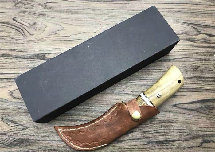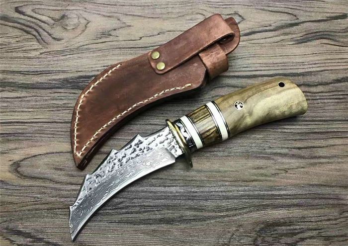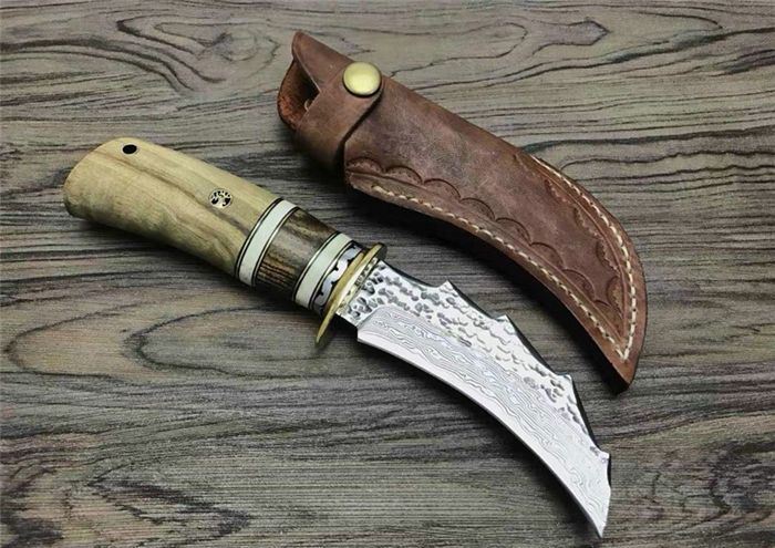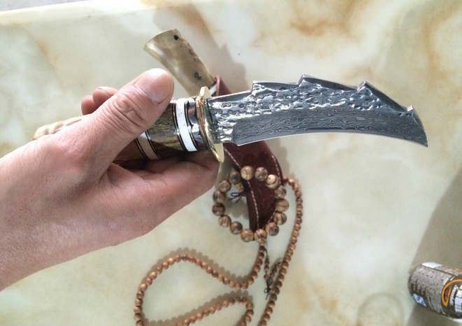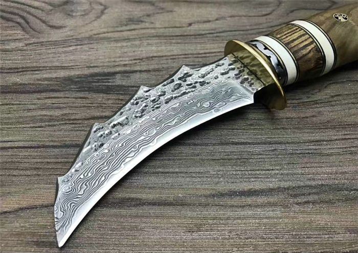 大马士革龙爪刀 全长:22cm 刃长:10cm 厚度:3.5mm 硬度:59HRC 手柄材料:铜片 白骨 白影 制作打磨而成 龙爪大马士革、手工非常精致哟,刀刃钢材用大马士革钢制作