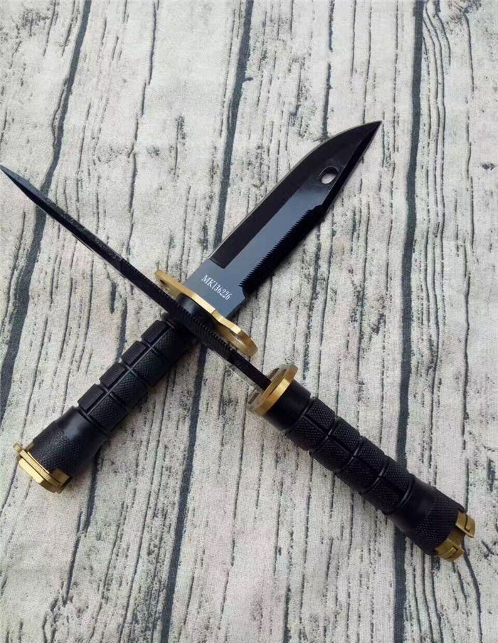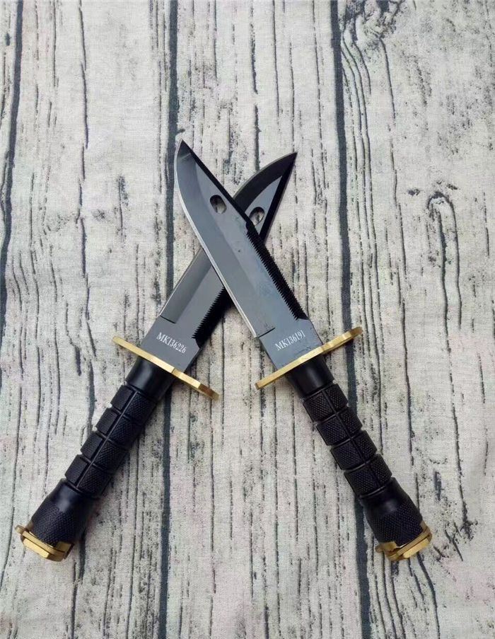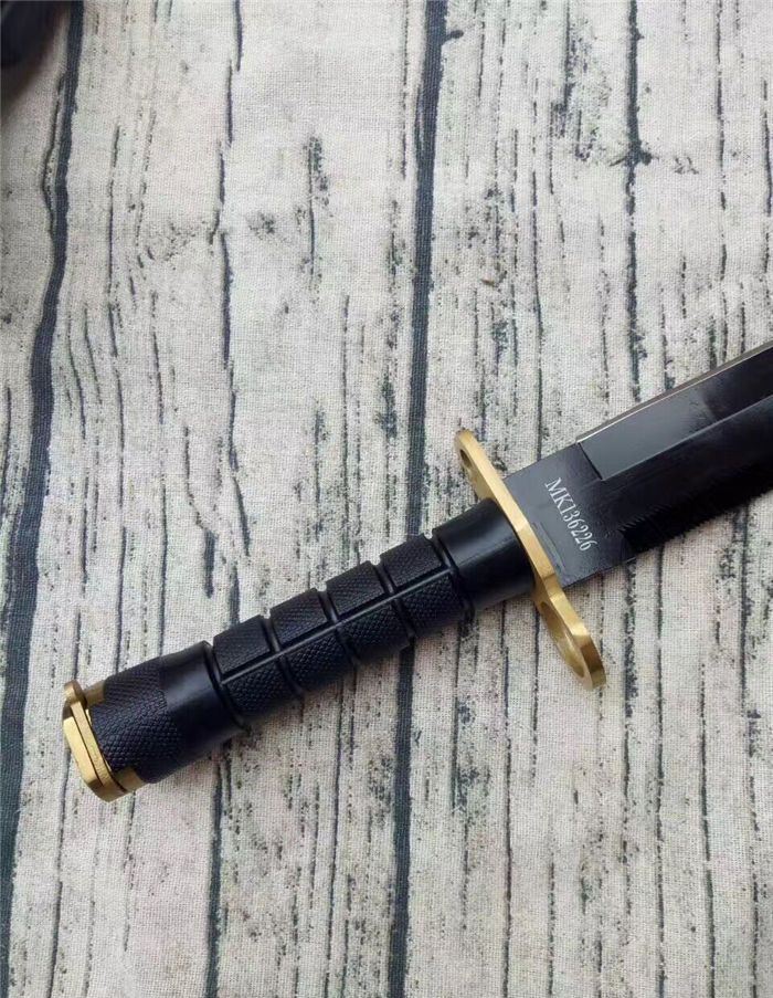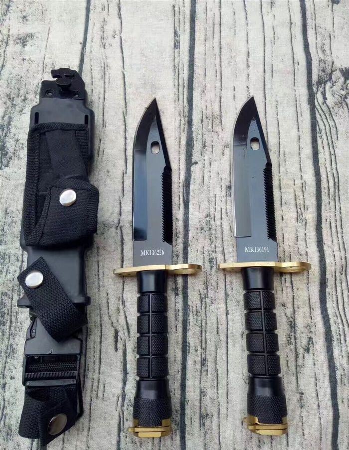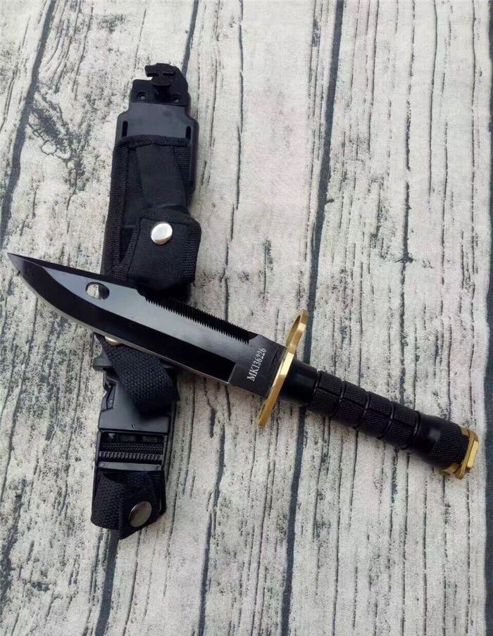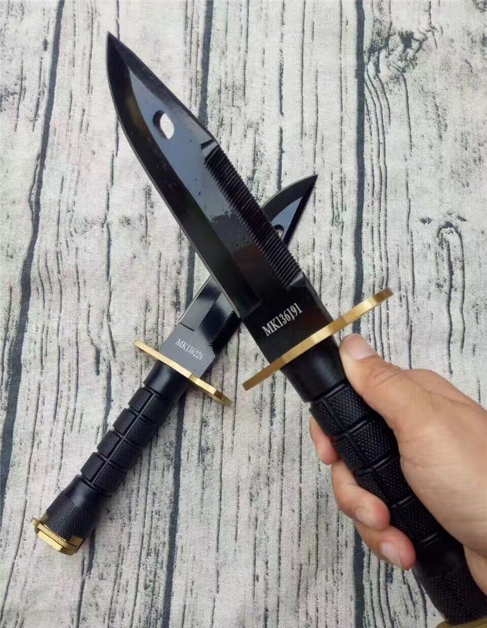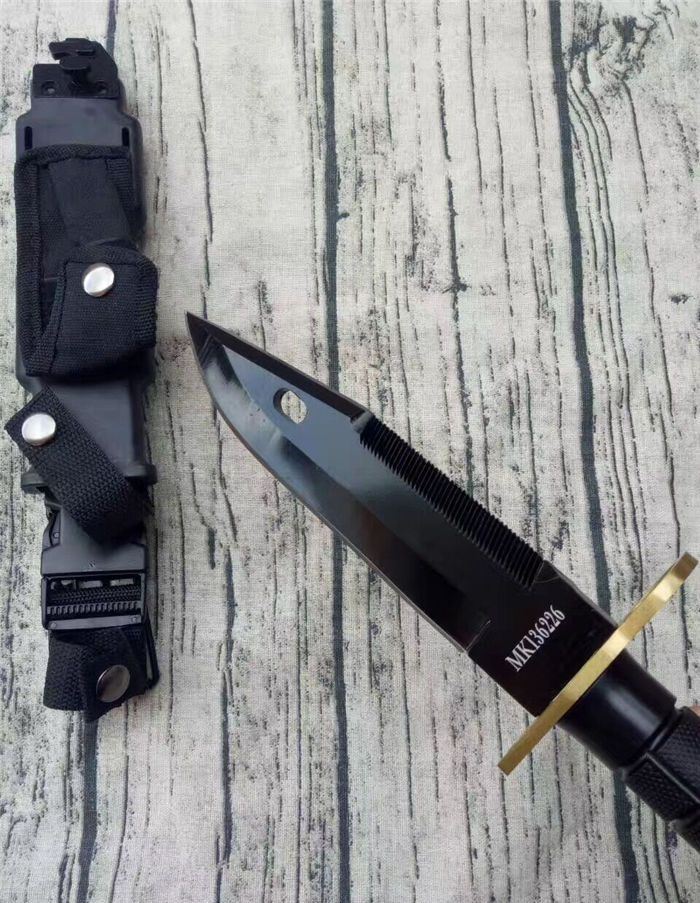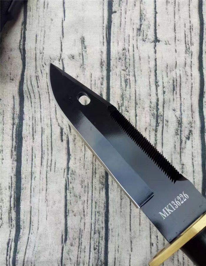 M9土豪黑色全刃直刀 全 长: 31cm 刃 长: 18.2cm 刃 厚: 6mm 刃 材: 5CR13 硬 度: 58-62HRC 表 面: 高温喷漆 柄 材: ABS 刀 鞘: ABS