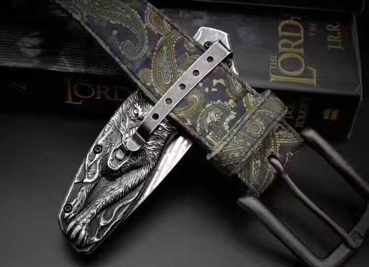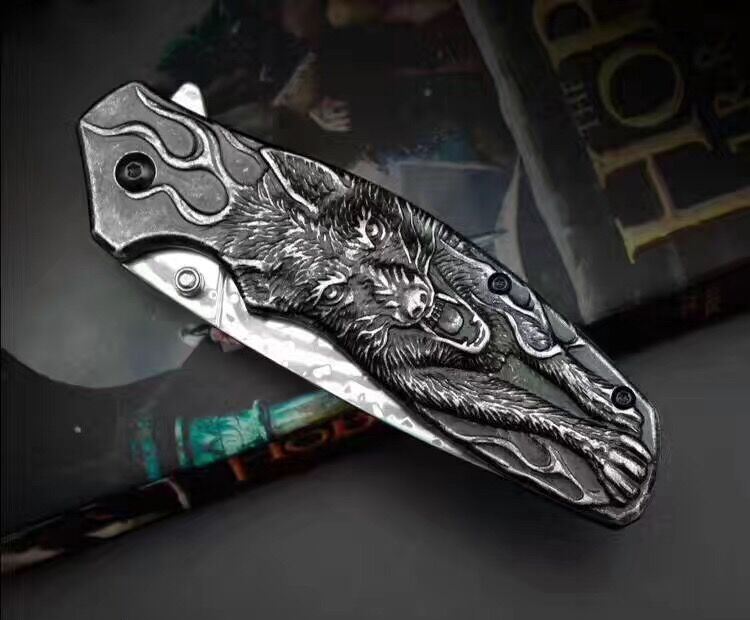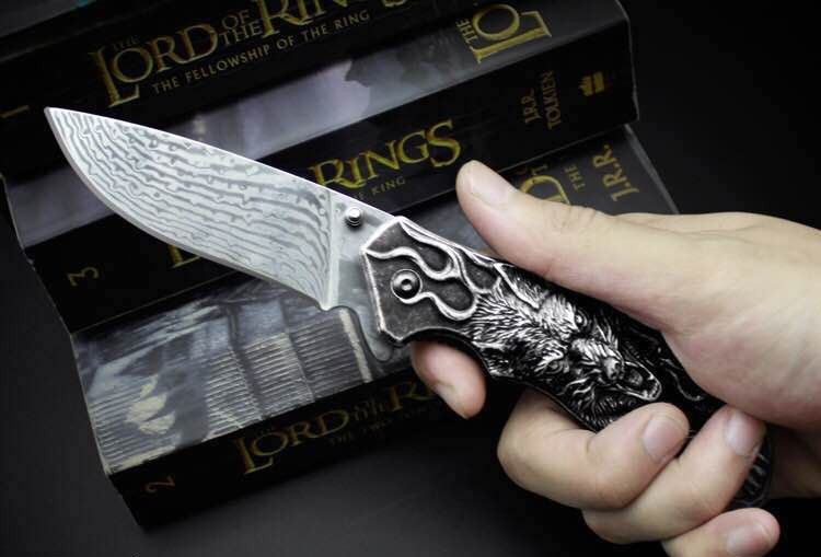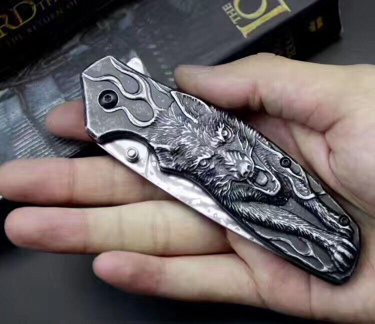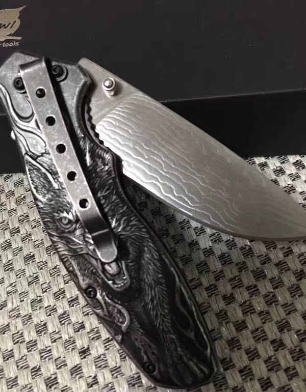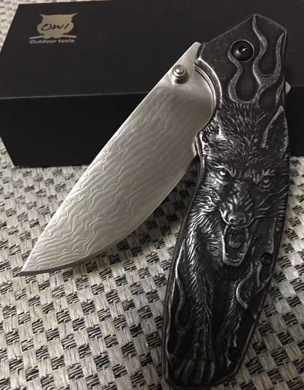 上古狼王大马士革折刀 刃材:大马士革钢(Damascus) 刃厚:3mm 刃宽:28mm 硬度:60HRC 柄材:不锈钢扎成狼图腾 手柄长度:120mm 刃长度:88mm 总长:205mm 净重:238g 刀刃表面处理:酸洗