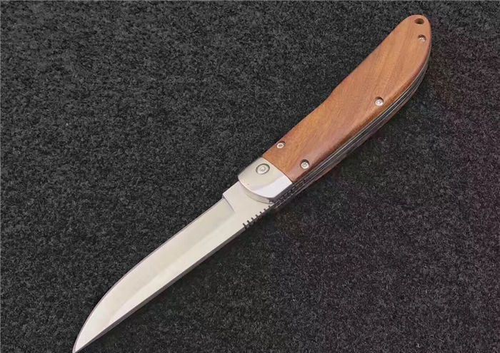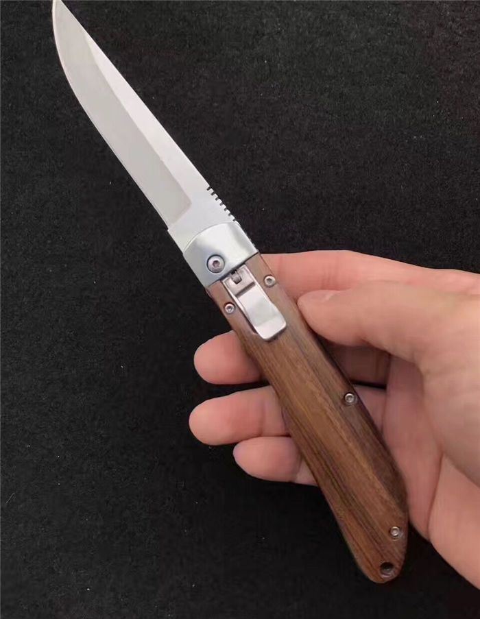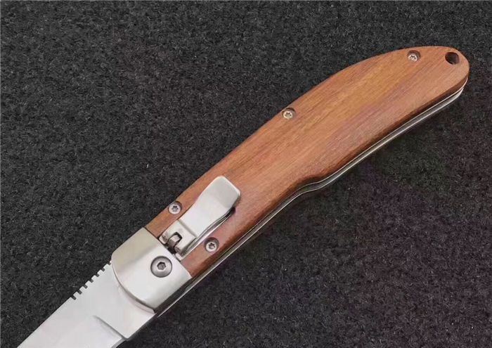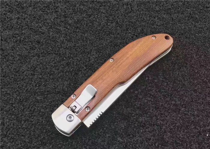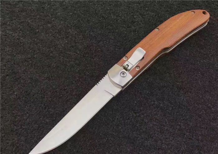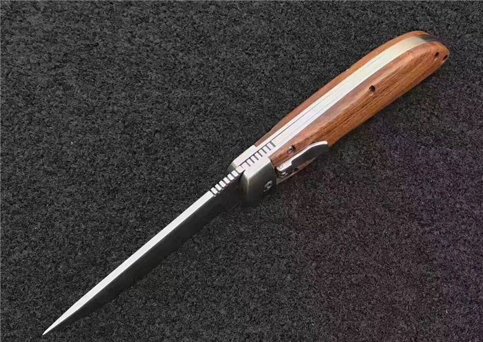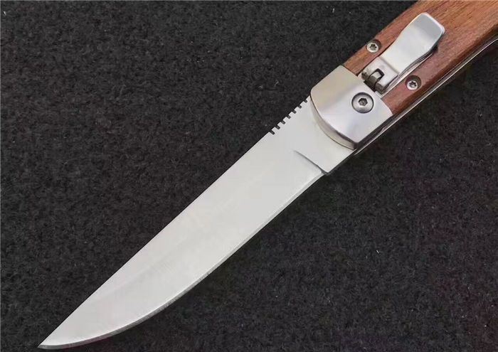 横开弹弹鱼式跳刀 全 长:21cm 刃 长:9cm 柄 长:12cm 刃 宽:25mm 刃 厚:3mm 刃 材:5CR13MoV 重 量:192g(含包装) 硬 度:58HRC 柄 材:巴马木 锁 型:钮钉锁 配 置:尼龙套