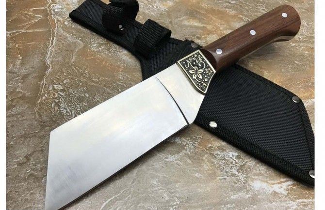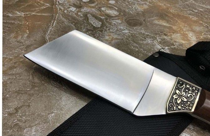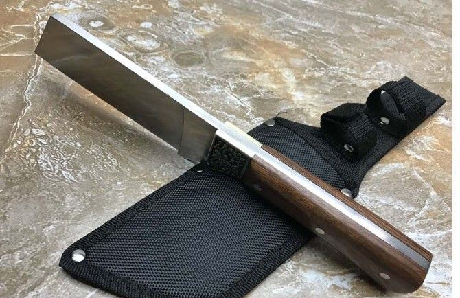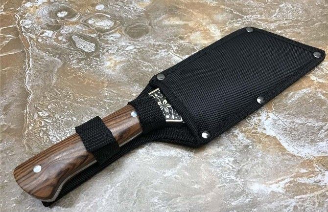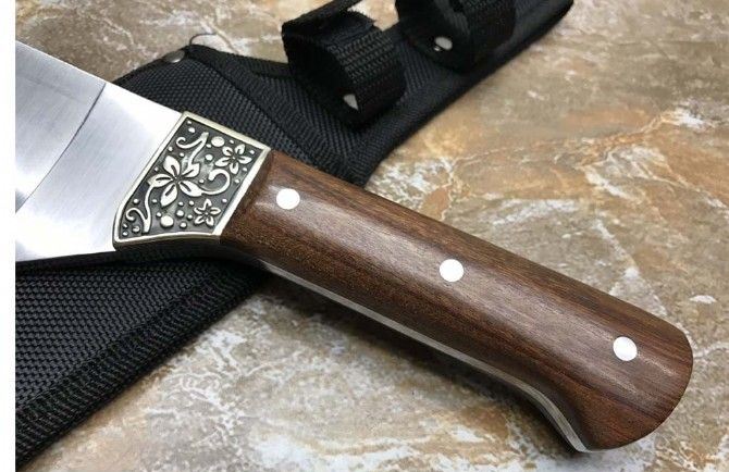 榴莲刀 全长:28.5cm 刃长:12.8cm 柄长:13cm 刃厚:0.58cm 刃宽:5.5cm(最宽处) 刃材:5c13 硬度:58HRC 柄材:酸枝木,龙骨一体的+雕花铜头 净重:230g 刀套:上等牛津套 工艺:真空淬火