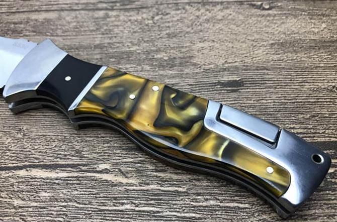 哥伦比亚S330折刀 全 长:22.6cm 刃 长:12.6cm 刃 宽:3cm(最宽处) 刃 厚:2.7mm 刃 面:砂光 刃 材:3Cr13 硬 度:56HRC 柄 长:10cm 柄 材:仿彩贝+双钢头 毛 重:184克(含包装) 锁 型:制尾 包 装:尼龙套、彩盒