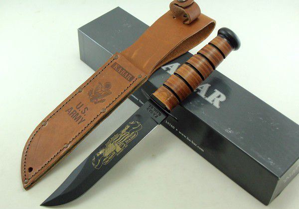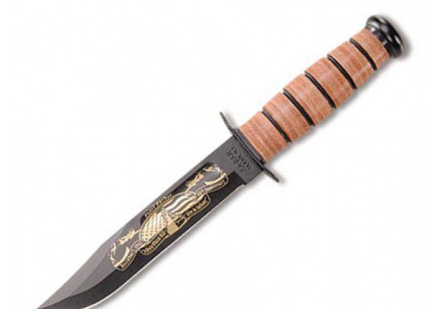 美军珍珠港纪念版卡巴Ka Bar9108 刃材:1095高碳钢 柄材:真皮压制 全长:30.2厘米 刃长:17.8厘米 刃厚:0.42厘米 硬度:57-58HRC 重量:320克 品牌:美国 产地:美国 刀鞘:原厂刀鞘
