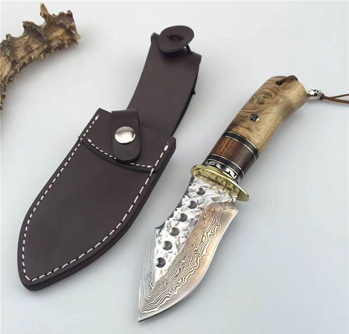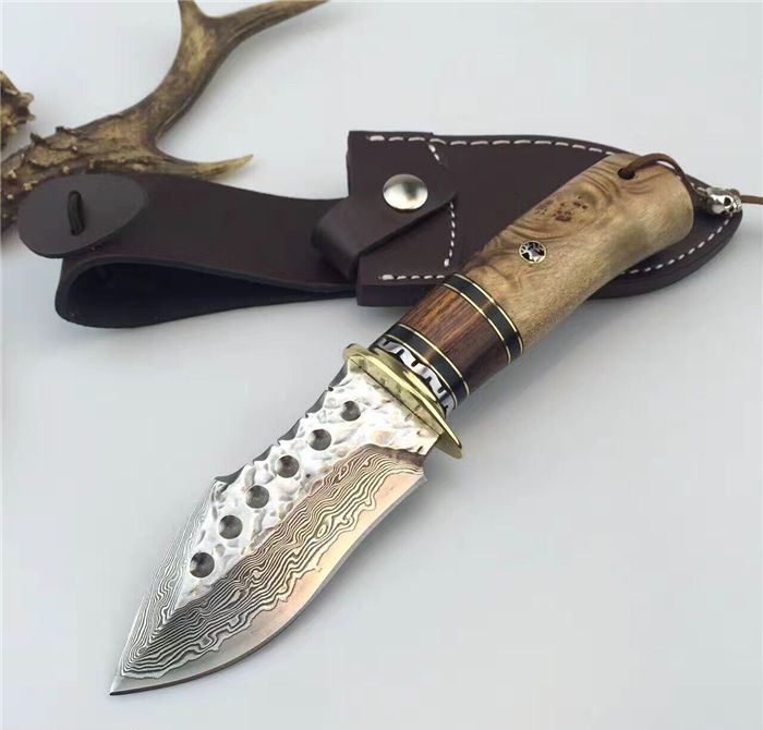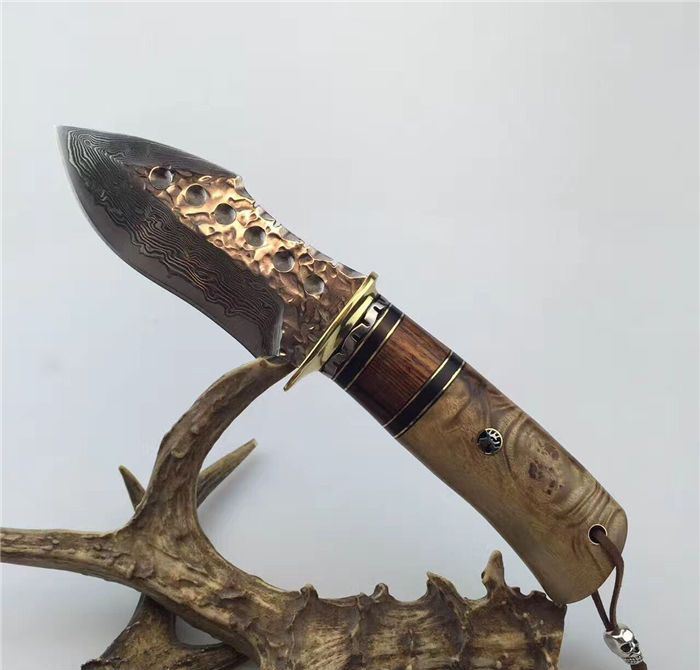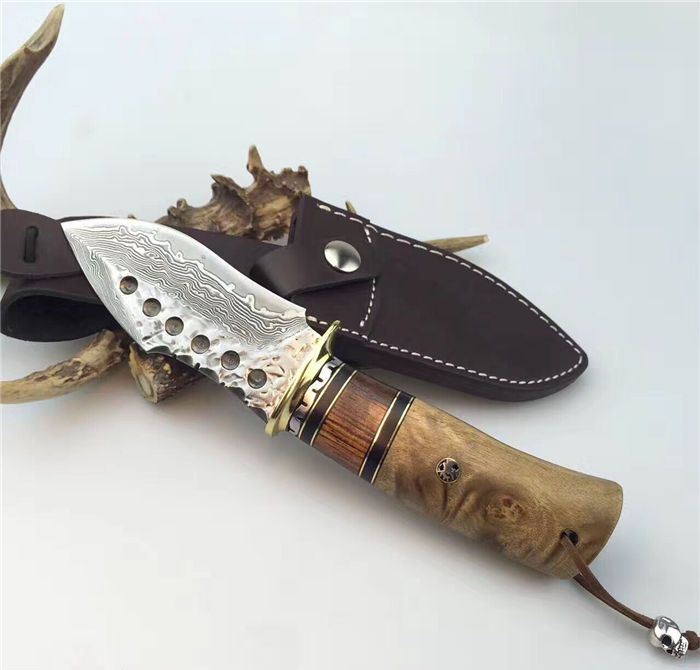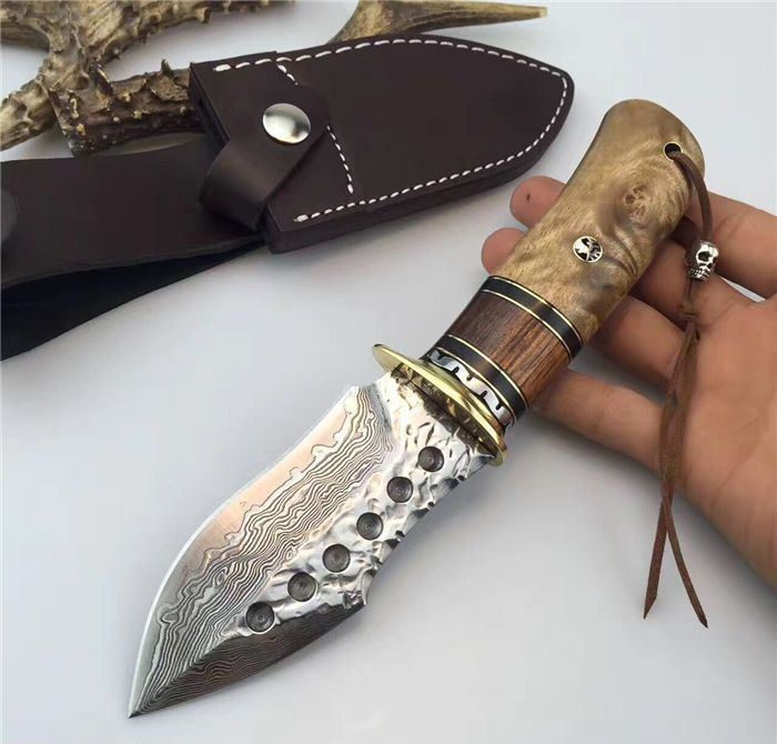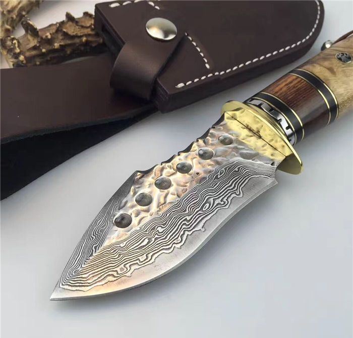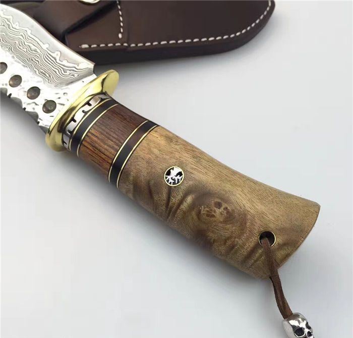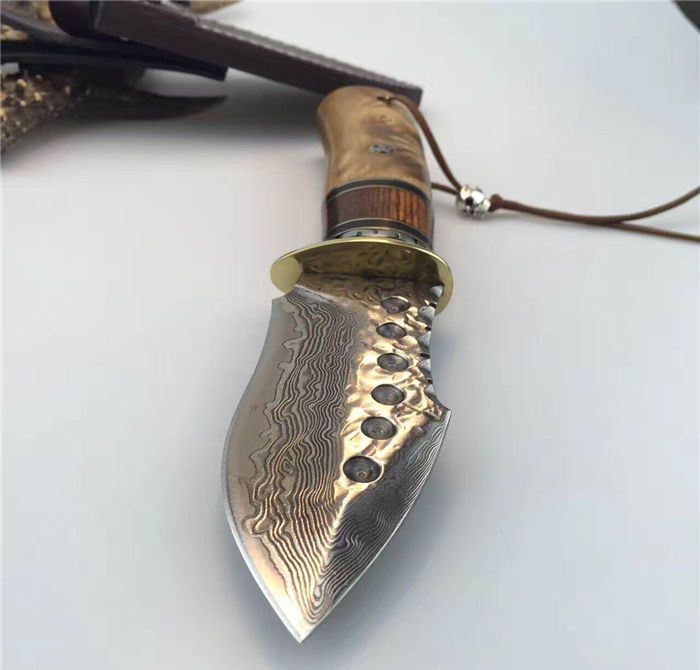 虎鲸大马士革手工刀 全长:24cm 刃长:12cm 刃厚:4.2mm 硬度:60HRC 刃材:大马士革钢刀刃 柄材:黄铜护手+黑牛角+斑马木+白影木 刀刃六孔圆点花纹凹凸锻打保留工艺、手柄鹿头柳钉固定、配真牛皮刀套、礼品盒包装