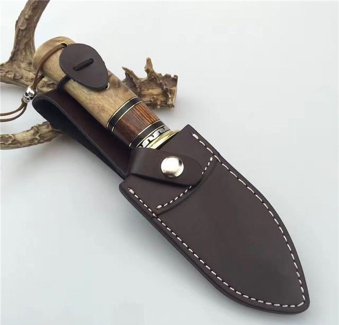 刀刃六孔圆点花纹凹凸锻打保留工艺、手柄鹿头柳钉固定、配真牛皮刀套、礼品盒包装