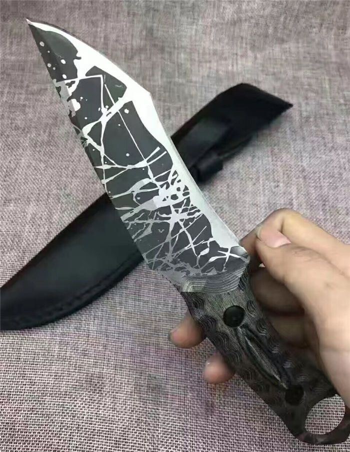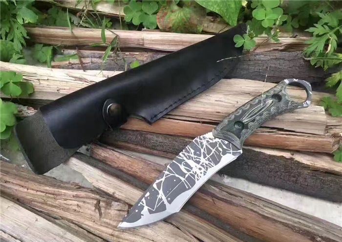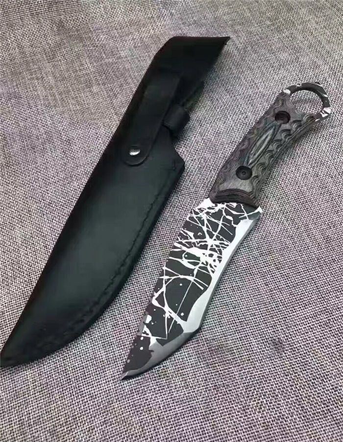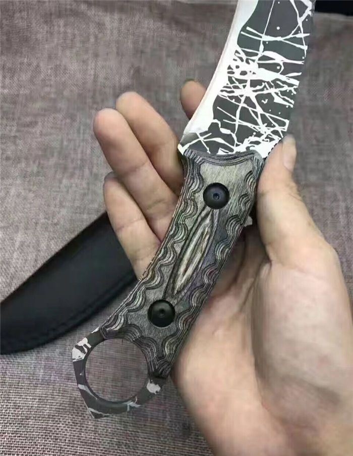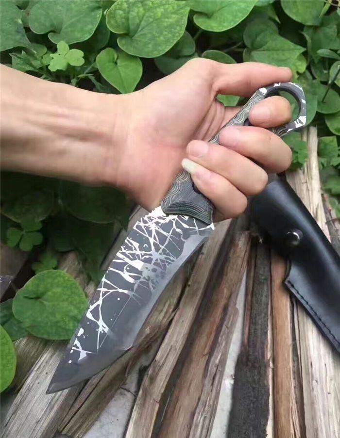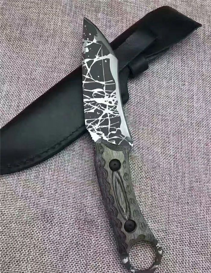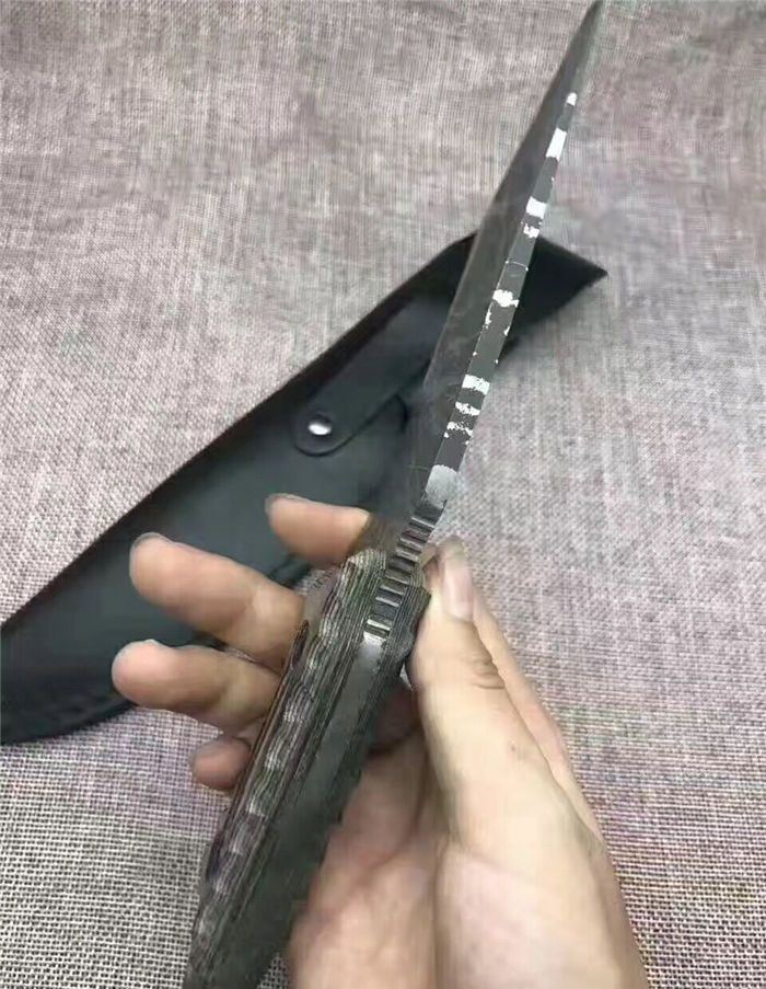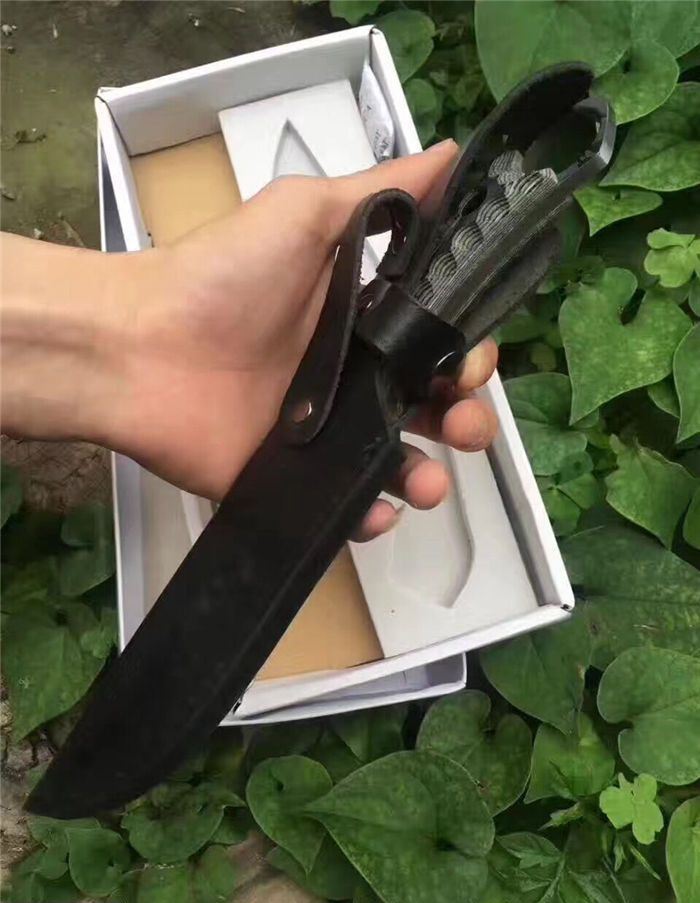 松田菊男手环匕首 全长:25㎝ 刃长:13㎝ 柄长:12㎝ 刃宽:4㎝ 刃材:7cr13 柄材:米克塔 硬度:58hrc 重量:400克 配皮套