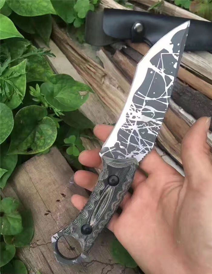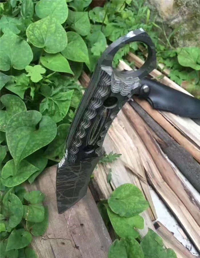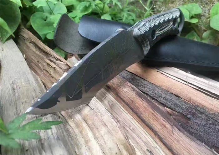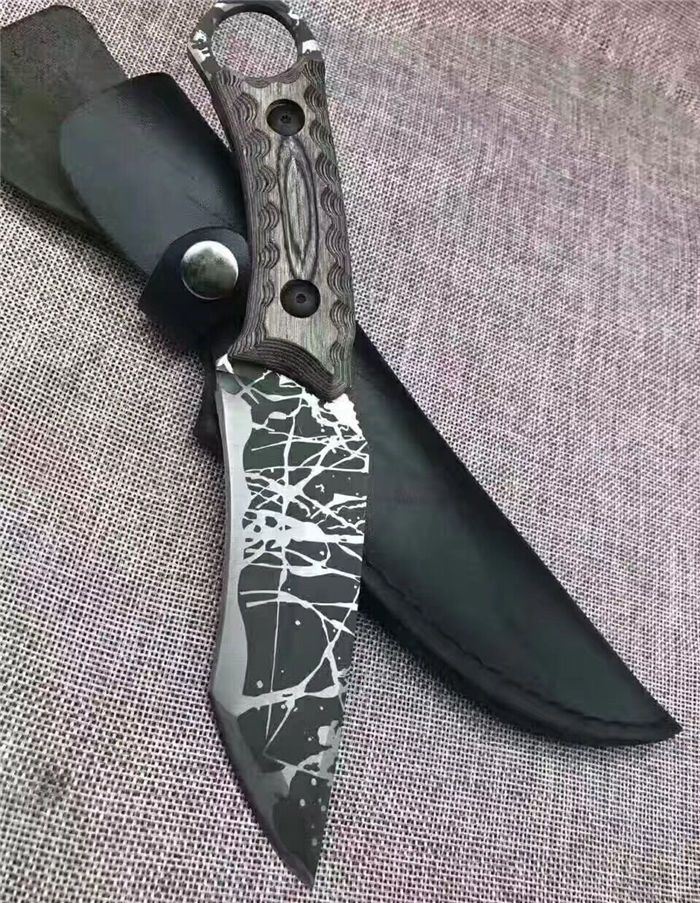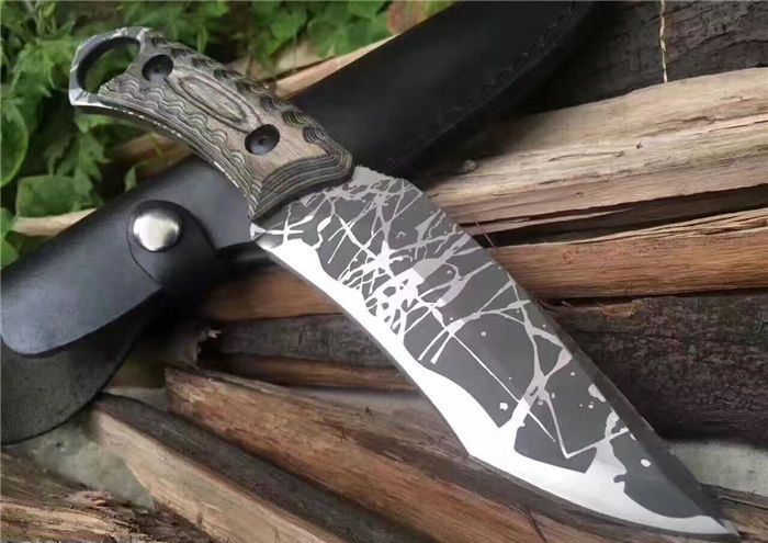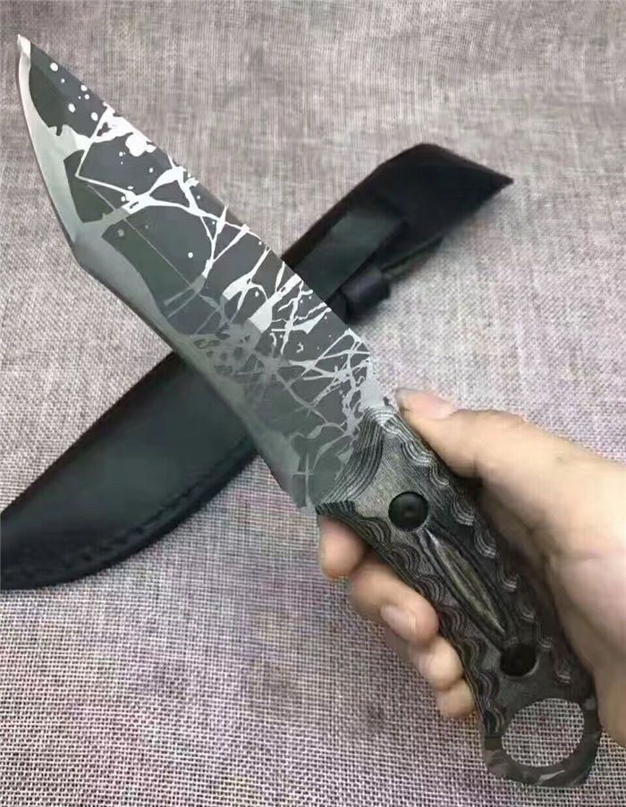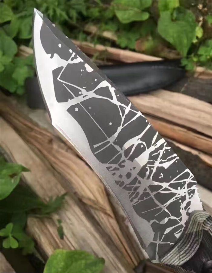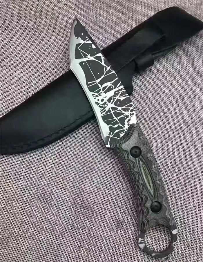 松田菊男手环匕首 全长:25㎝ 刃长:13㎝ 柄长:12㎝ 刃宽:4㎝ 刃材:7cr13 柄材:米克塔 硬度:58hrc 重量:400克 配皮套