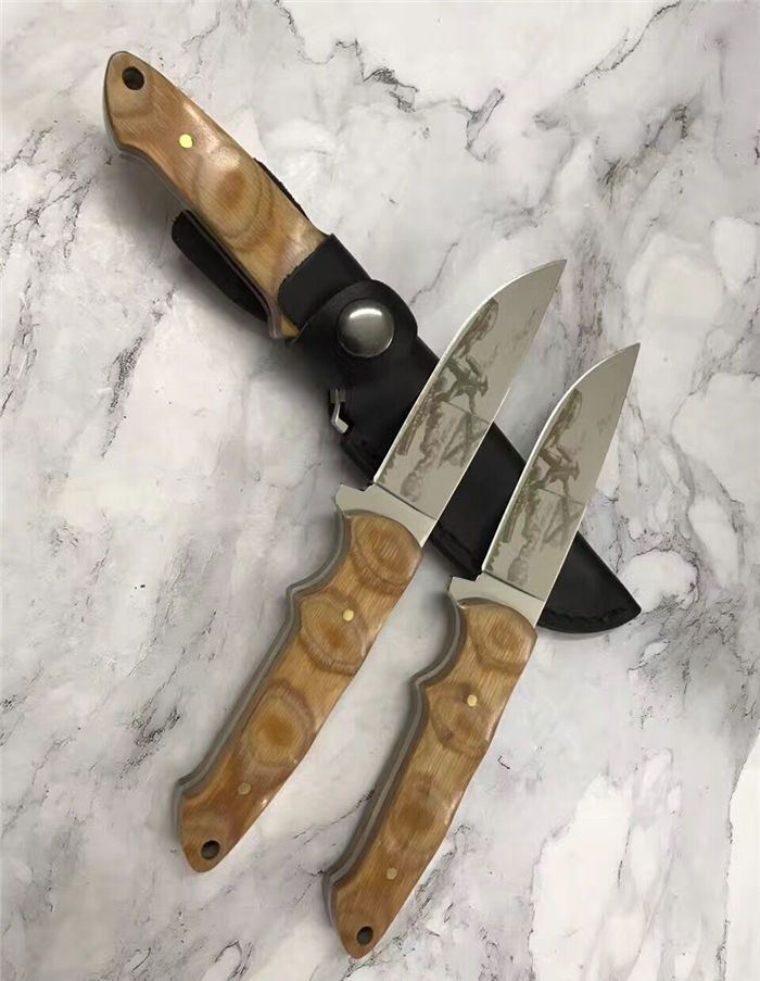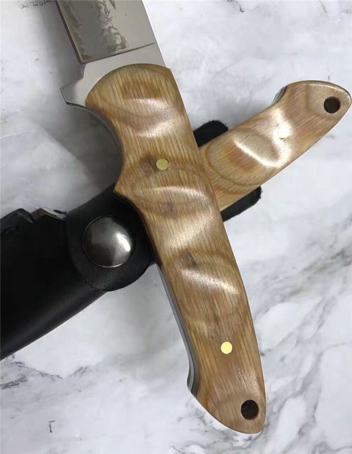 冲天炮直刀 全 长: 19cm 刃 长: 8.5cm 刃 宽: 2.5cm(最宽处) 柄 长: 10.3cm 刃 厚: 0.32cm 刃 材: 440C 硬 度: 57RHC(高硬度) 表 面: 镜光 柄 材: 刀身贯穿刀柄,两面夹波浪型彩木 净 重: 140克(含套) 其 他: 镜光的刀身镭射战斗场面的图案。一体龙骨结构,配牛皮刀套