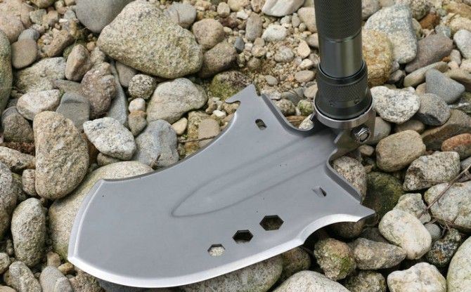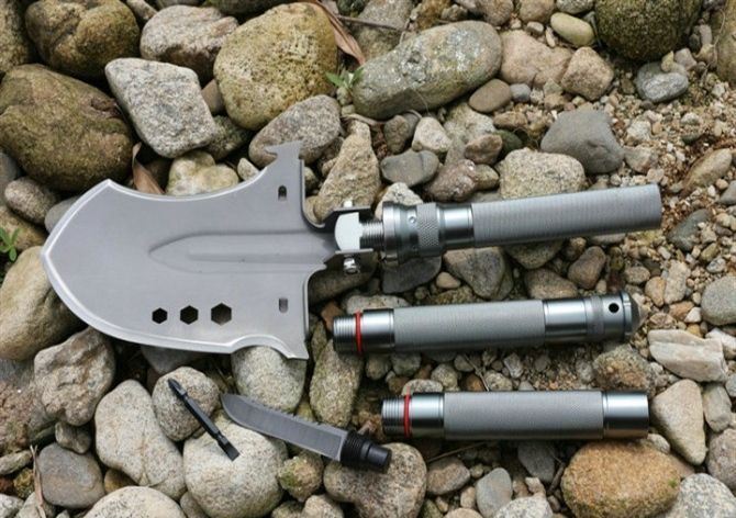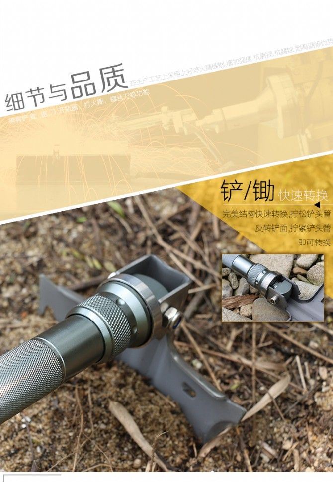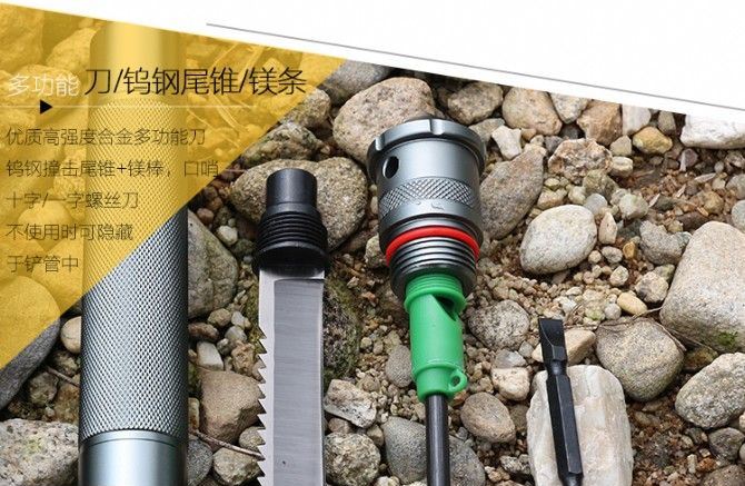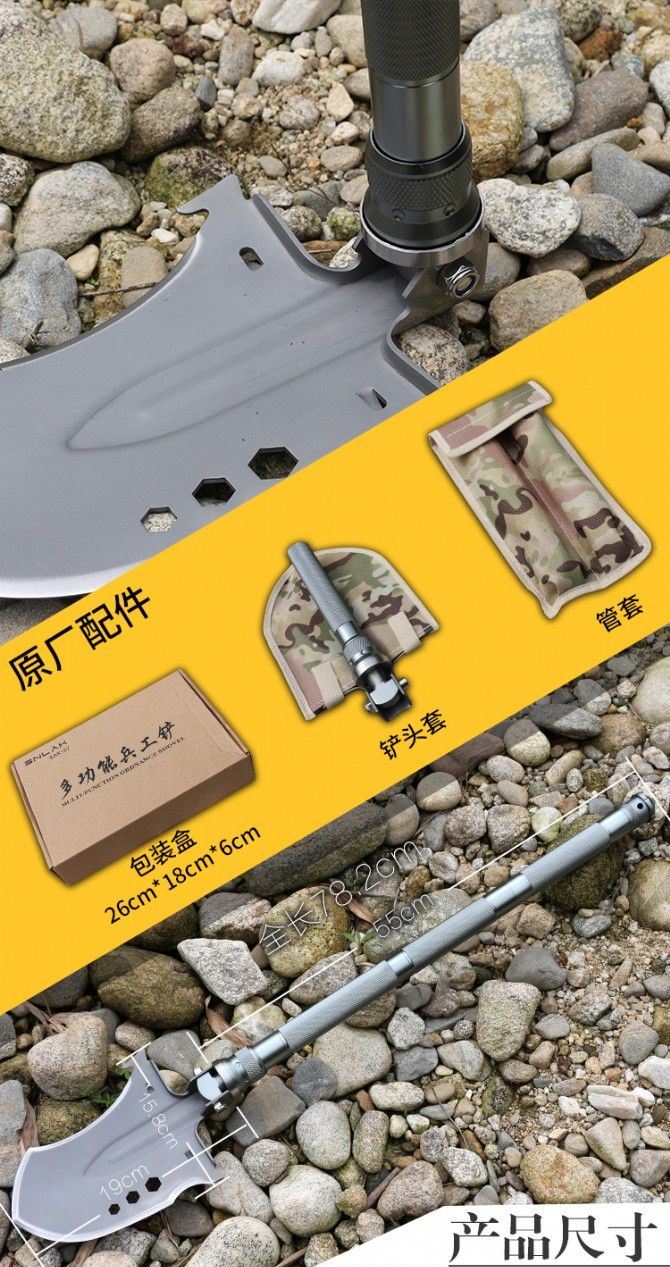 功能:有铲,锄 ,锯,刀,开瓶器,打火棒,撞击器,哨子,等功能,在生产工艺上采用上好淬火高碳钢,增加强度,抗磨损,抗腐蚀,耐高温等优势.有把铲在手,登山,外出永不怕