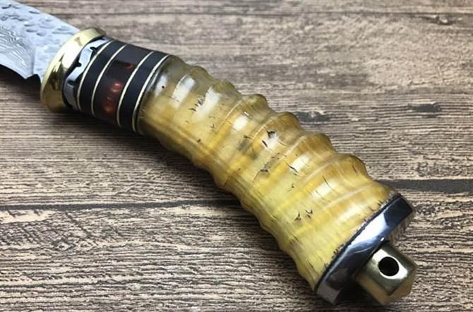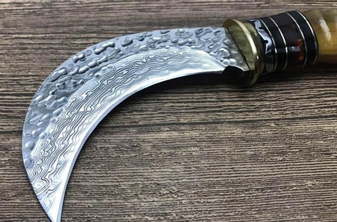 大马士革镰刀 总 长: 19.5cm 刃 长: 9.5cm 柄 长: 11cm 刃 宽: 2.9cm(最宽处) 硬 度: 59HRC 刃 厚: 0.4cm 柄 材: 野生黄羊角 重 量: 250克含包装 刃 材: 手工锻打大马士革钢 表 面: 大马士革纹 其 他: 纸盒,真皮套