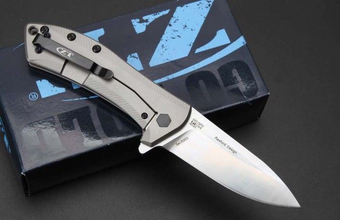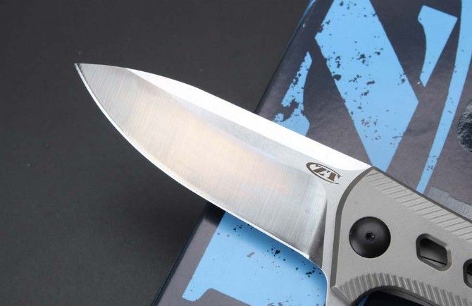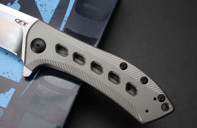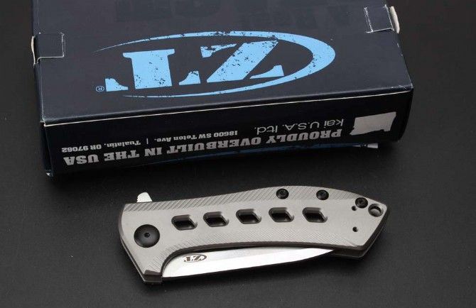零公差ZT0801蛇柄折刀 总长:208mm 刃长:89 mm 柄长:119mm 刃厚:4mm 刃宽:28 mm 刀刃表面处理:沙光 硬度:58-59HRC 净重:155克 刃材料D2 柄材:钛合金 轴承系统